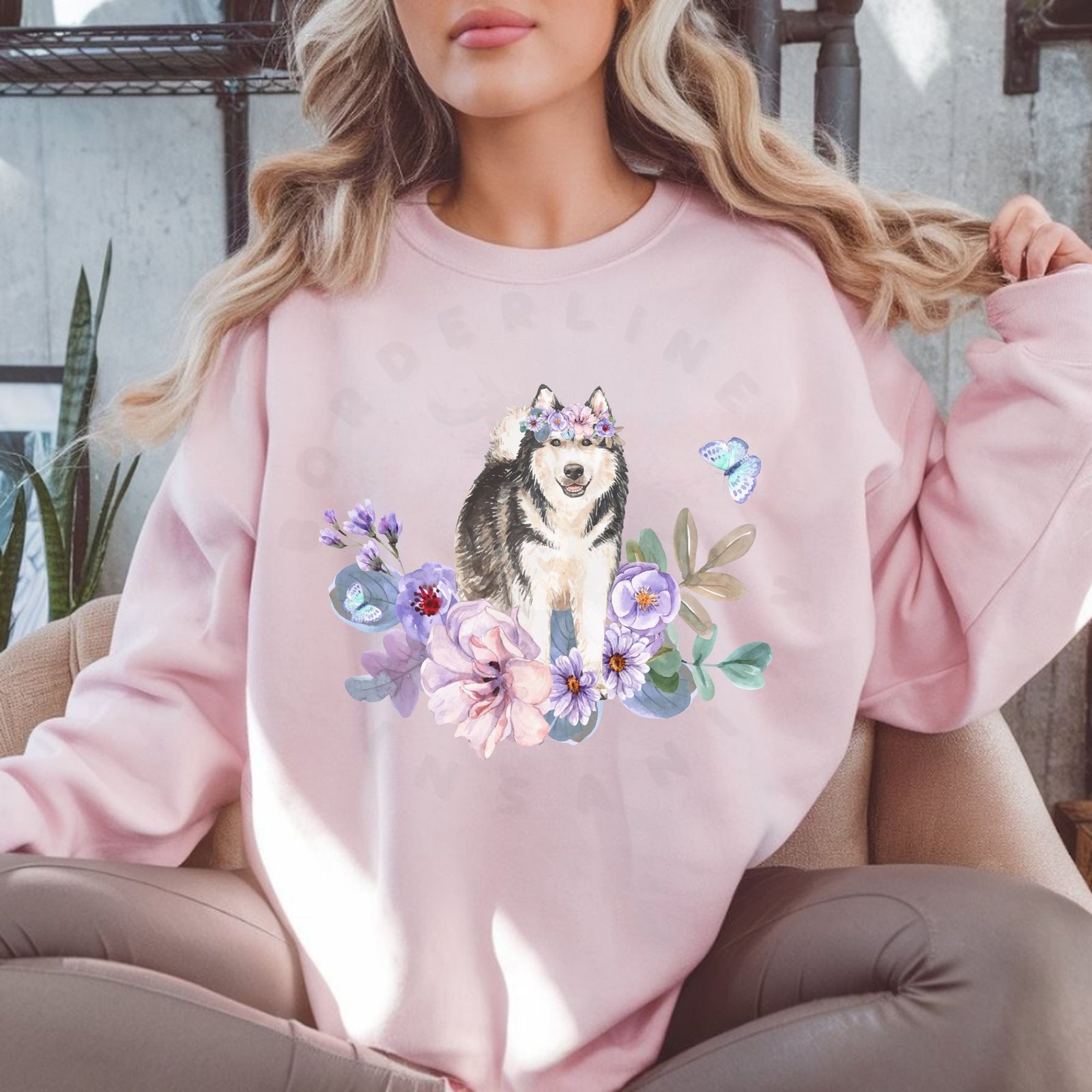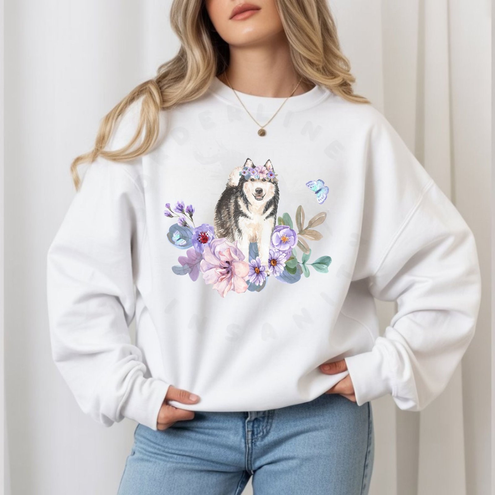 Cozy watercolor Malamute crewneck with purple/lavender florals. Stunning northern breed portrait. Perfect Malamute gift!