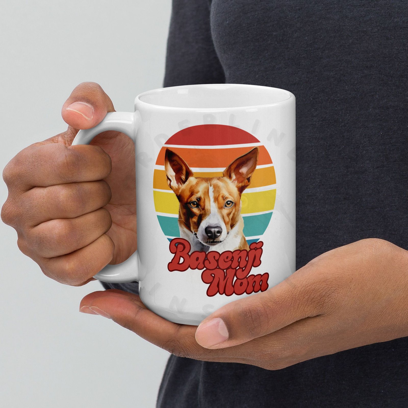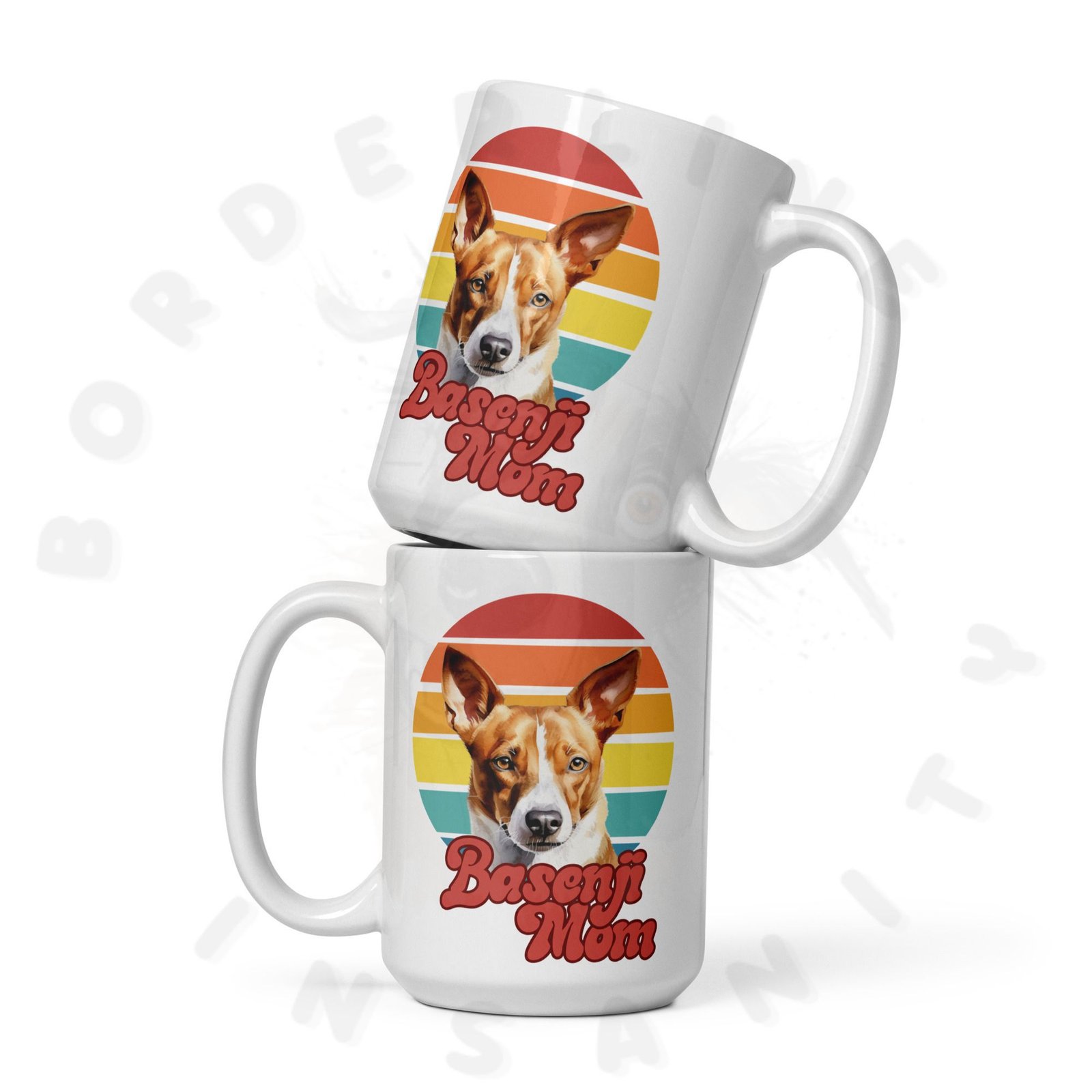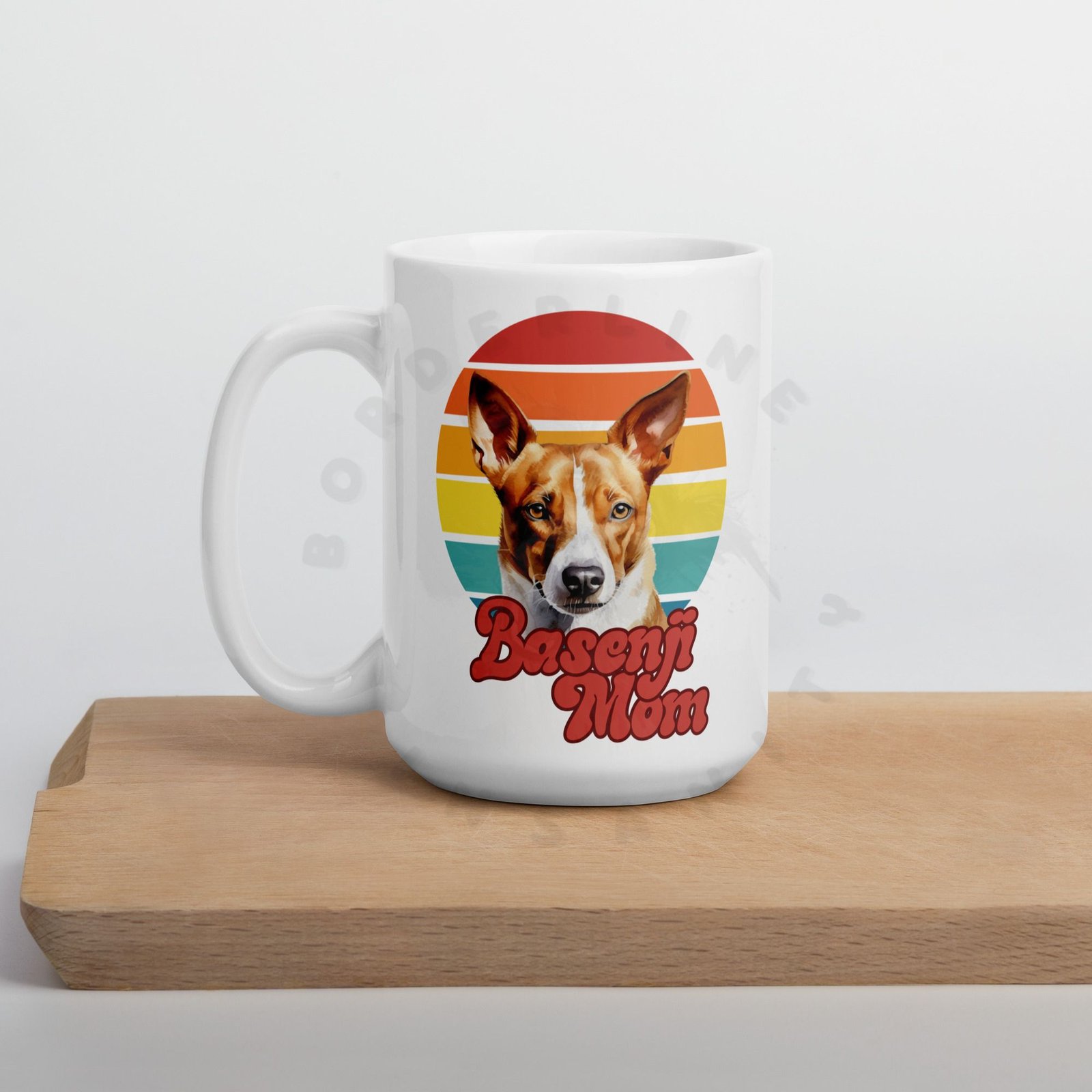 Show off your love for your Basenji every morning! This retro-inspired 15oz ceramic mug features a gorgeous watercolor Basenji portrait set against a warm sunset circle — bold, beautiful, and made for dog moms who wear their heart on their sleeve (and their mug on their desk).