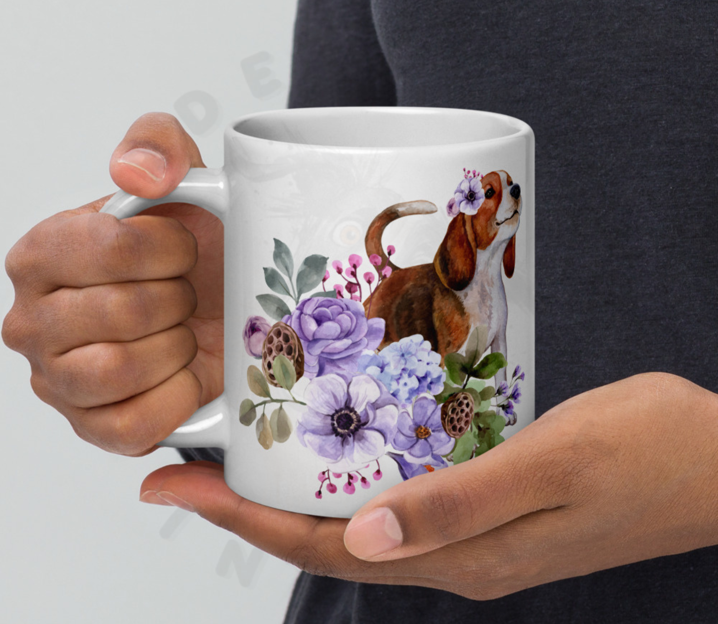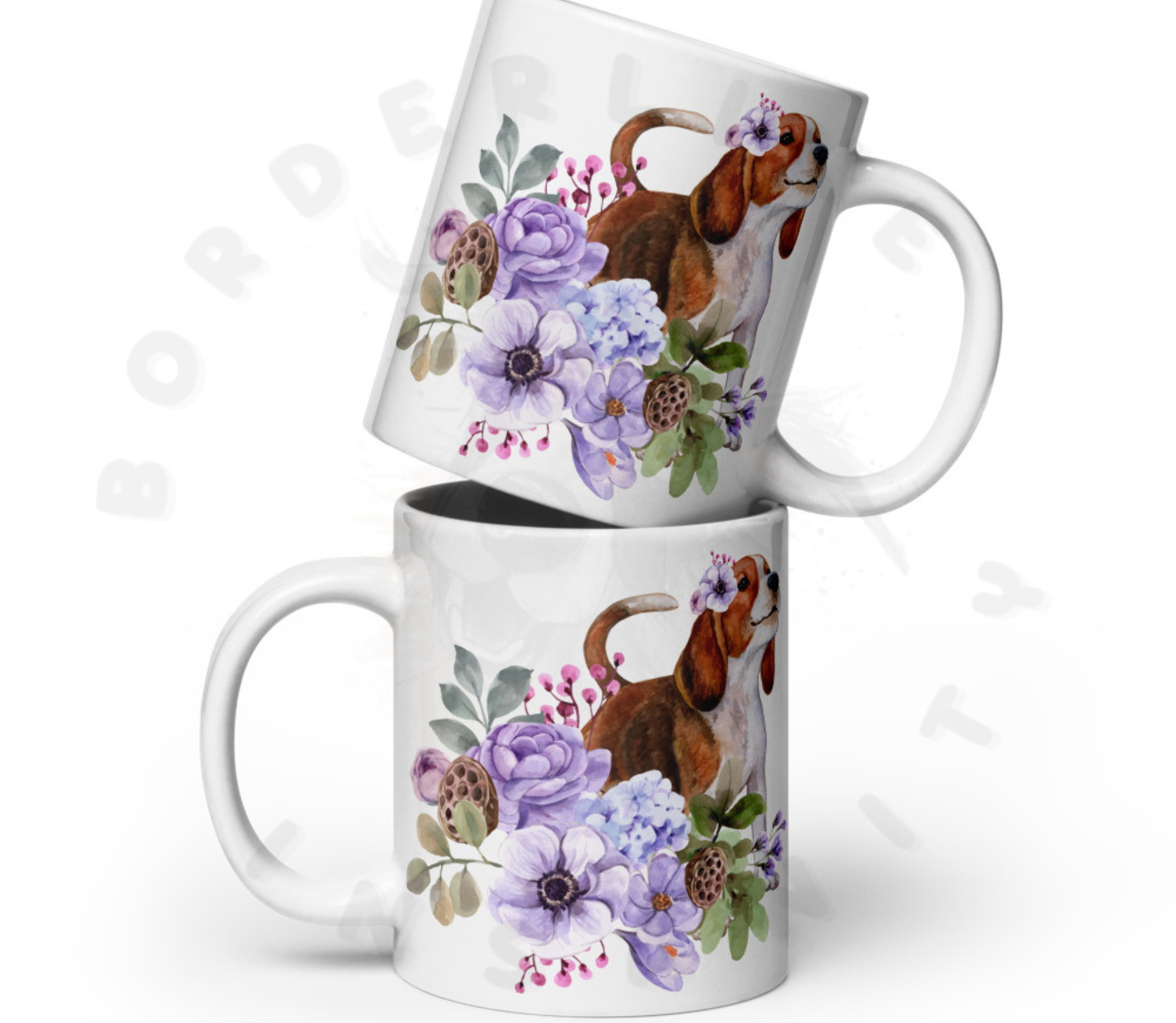This adorable mug showcases a charming Beagle surrounded by soft blue hydrangeas and lavender blooms. The Beagle’s expressive eyes and distinctive coat are beautifully complemented by the delicate watercolor flowers, creating a perfect tribute to this beloved hunting breed.