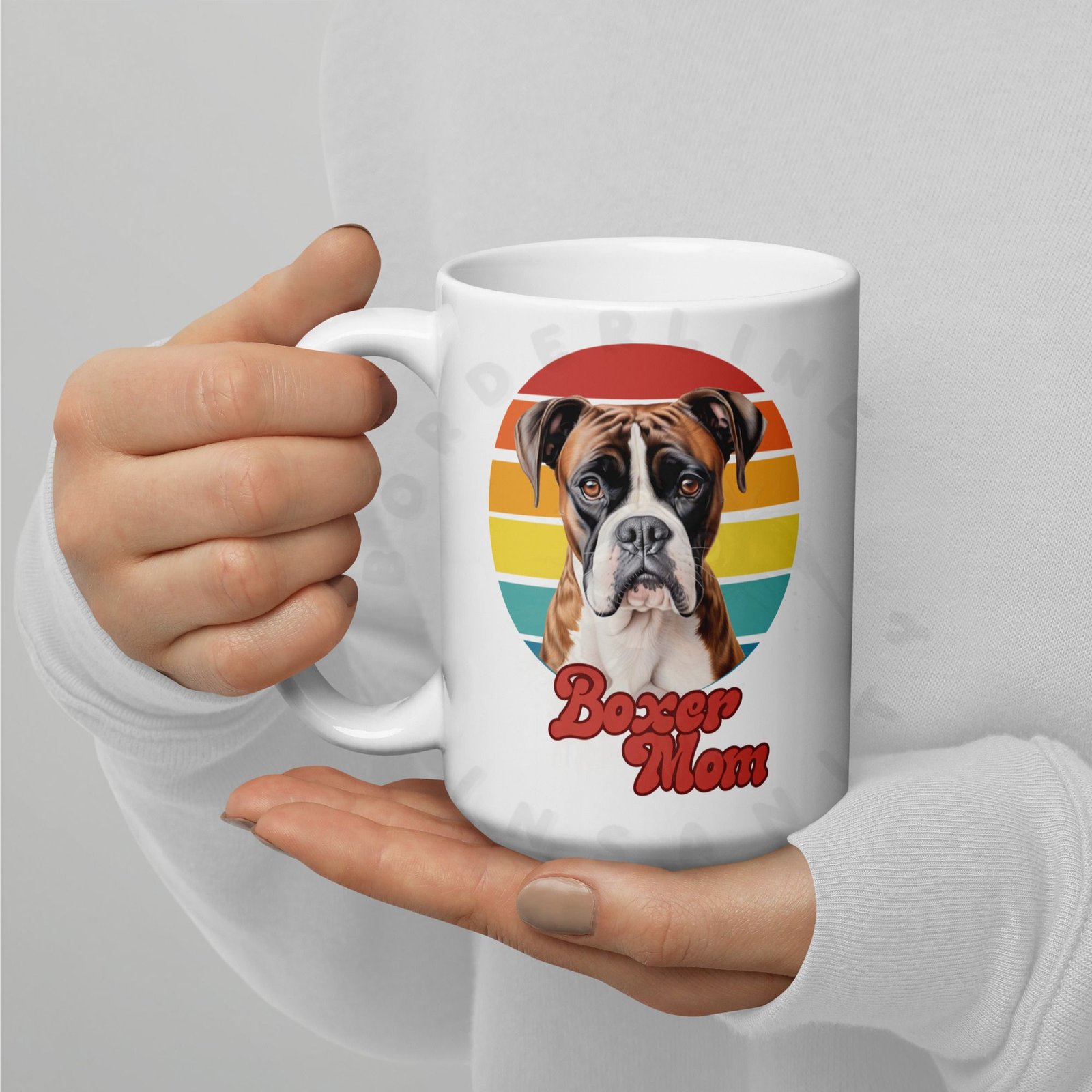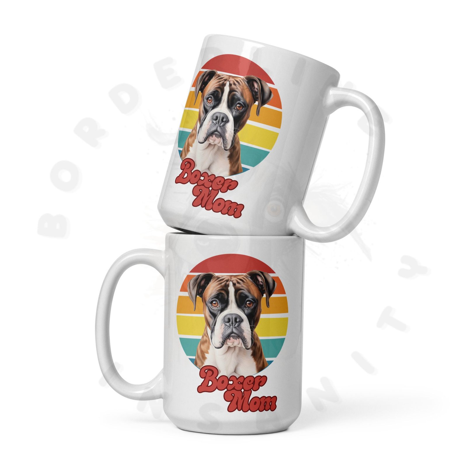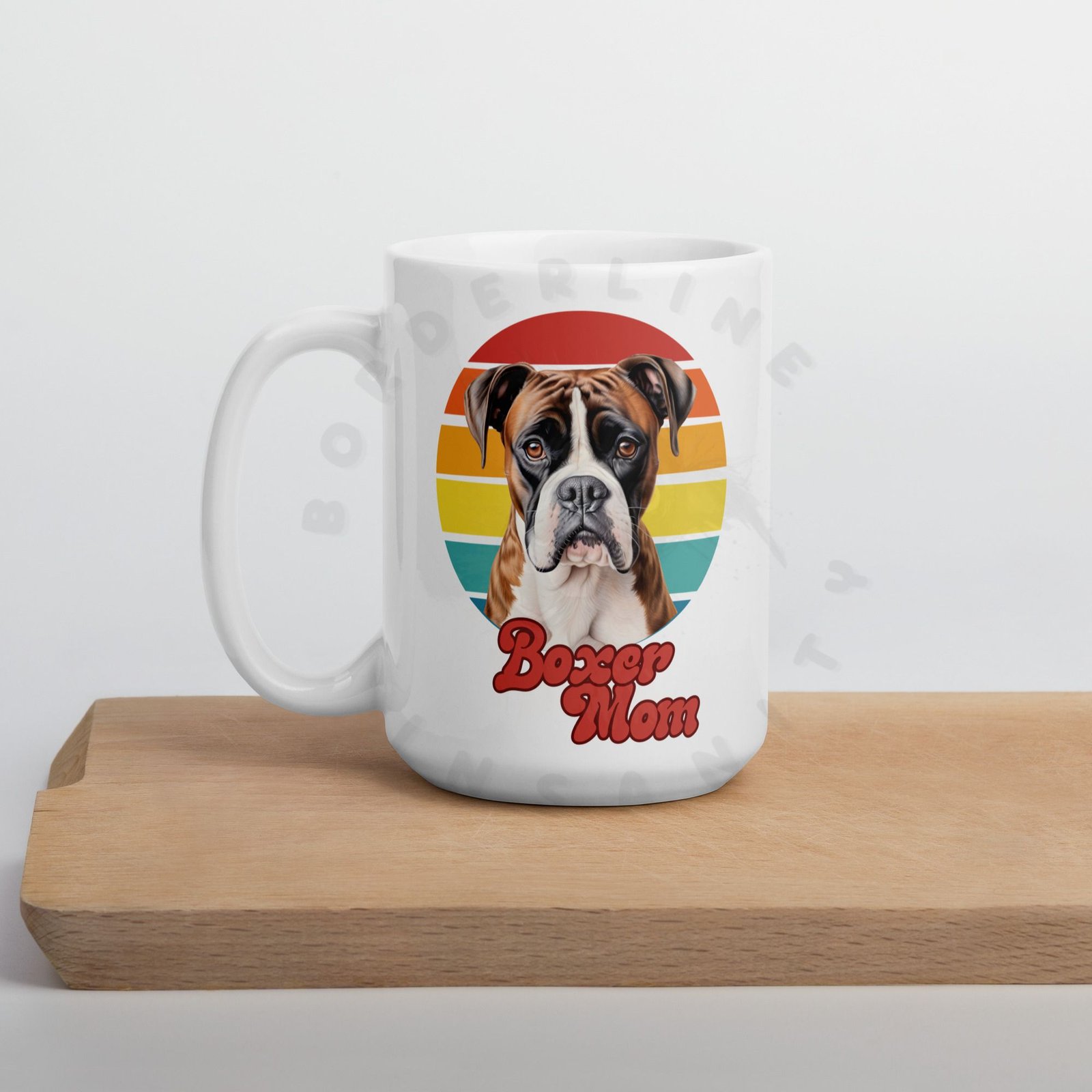 Show off your love for your Boxer every morning! This retro-inspired 15oz ceramic mug features a gorgeous watercolor Boxer portrait set against a warm sunset circle — bold, beautiful, and made for dog moms who wear their heart on their sleeve (and their mug on their desk).