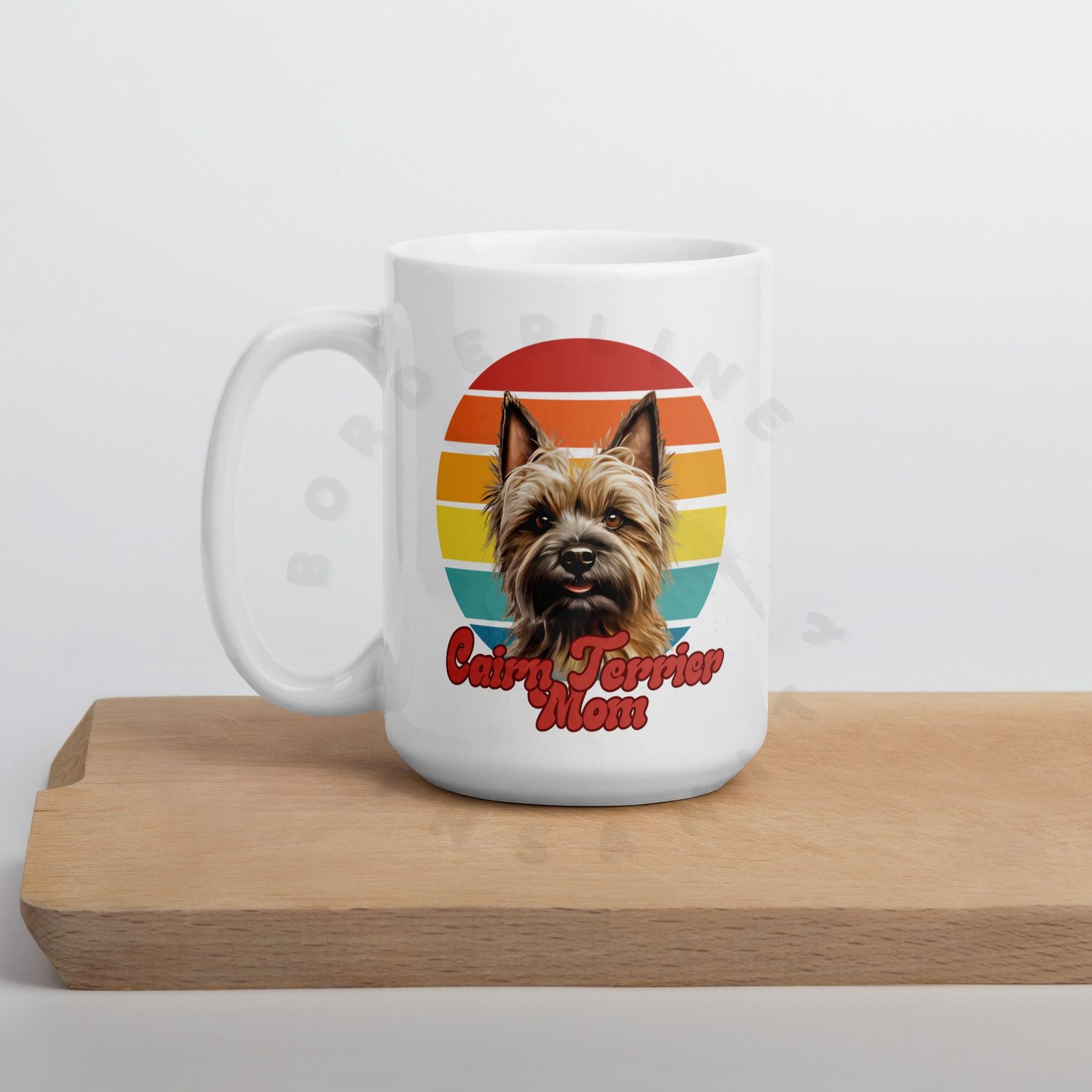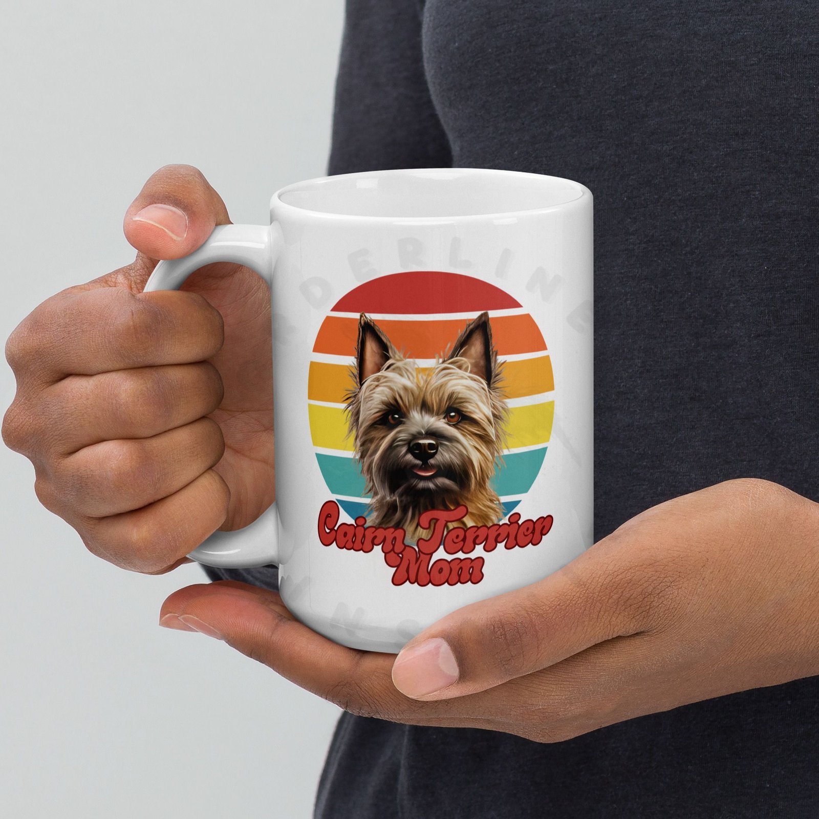Show off your love for your Cairn Terrier every morning! This retro-inspired 15oz ceramic mug features a gorgeous watercolor Cairn Terrier portrait set against a warm sunset circle — bold, beautiful, and made for dog moms who wear their heart on their sleeve (and their mug on their desk).