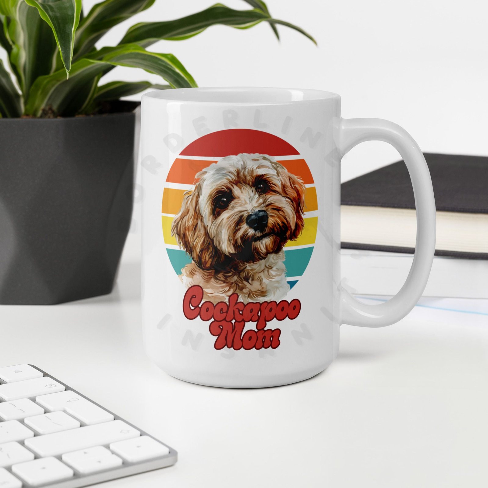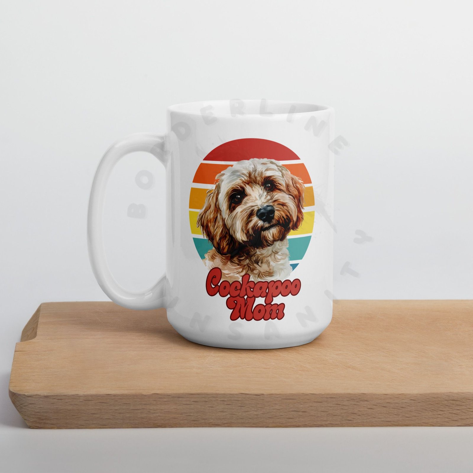 Show off your love for your Cockapoo every morning! This retro-inspired 15oz ceramic mug features a gorgeous watercolor Cockapoo portrait set against a warm sunset circle — bold, beautiful, and made for dog moms who wear their heart on their sleeve (and their mug on their desk).