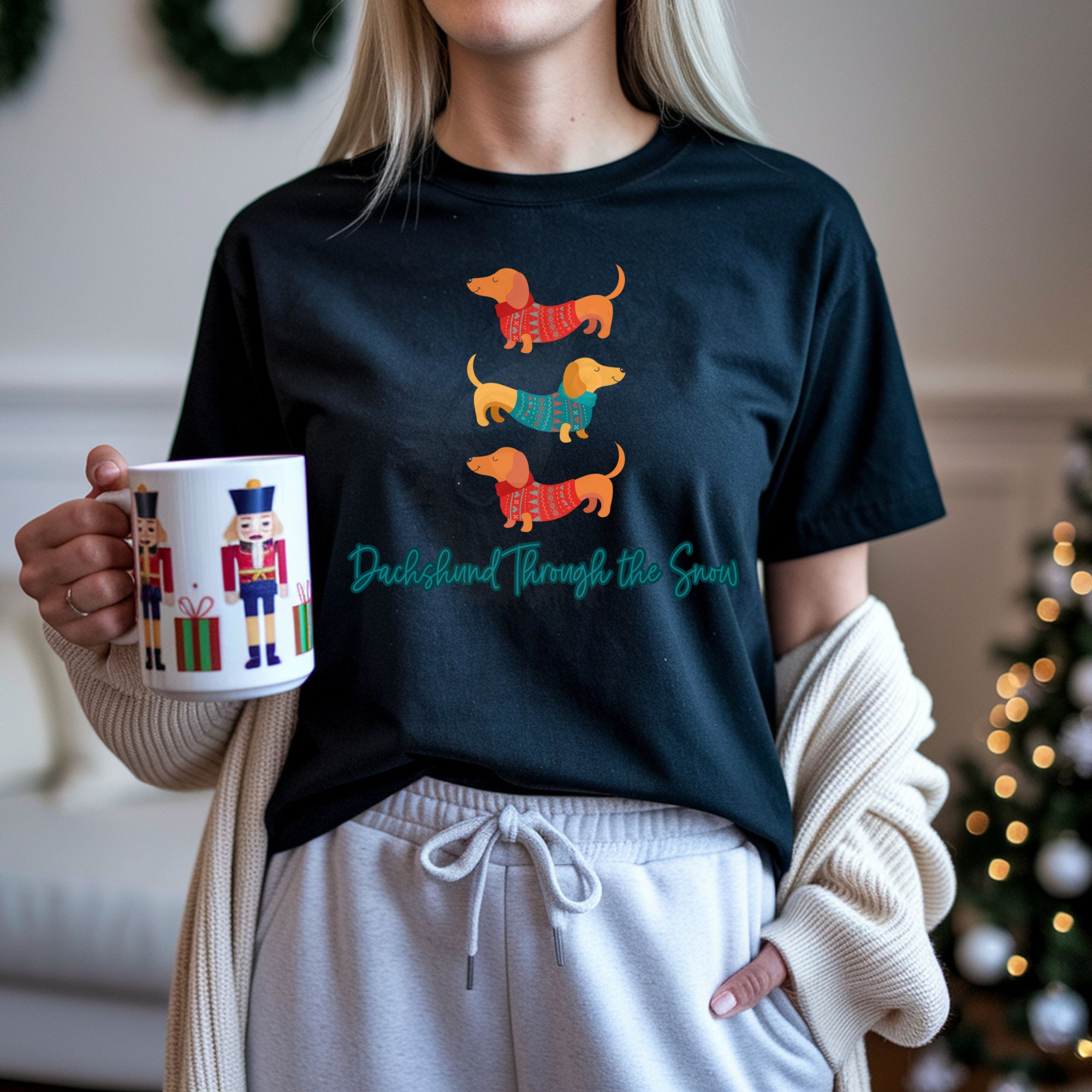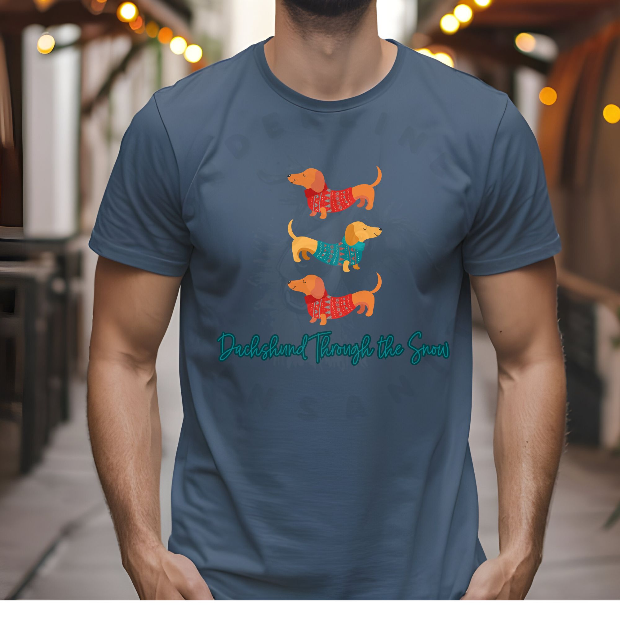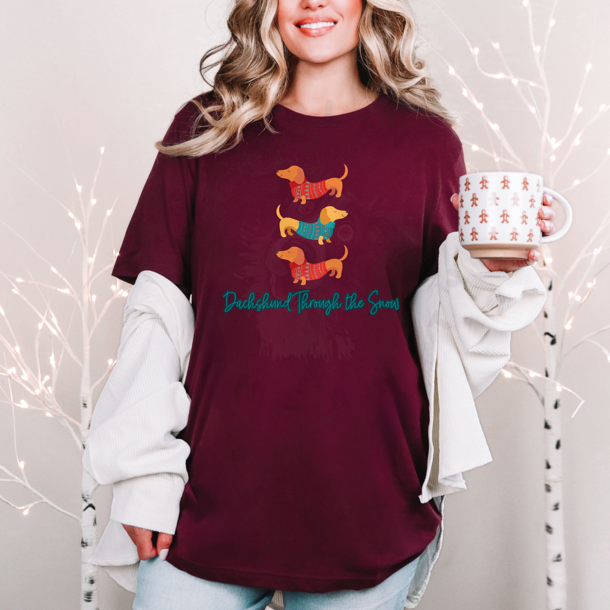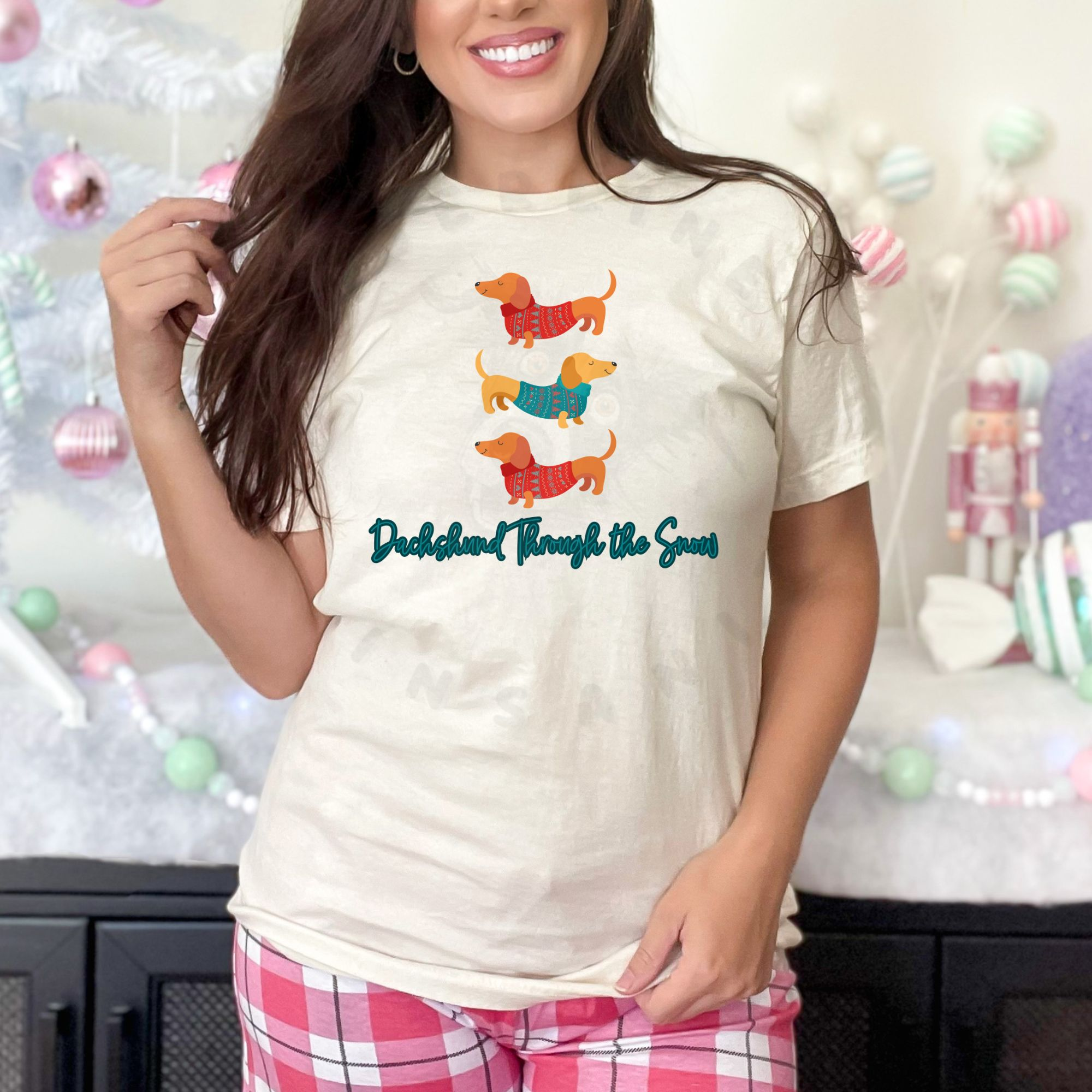 Celebrate the season with this modern “Dachshund Through the Snow” tee featuring three Dachshunds in festive shirts and stylish cursive text.