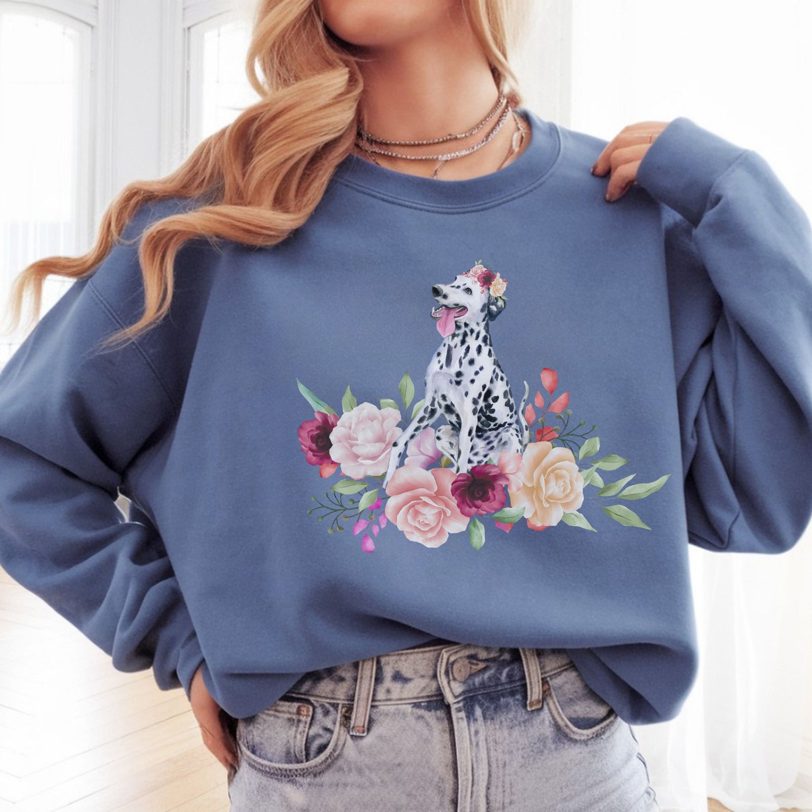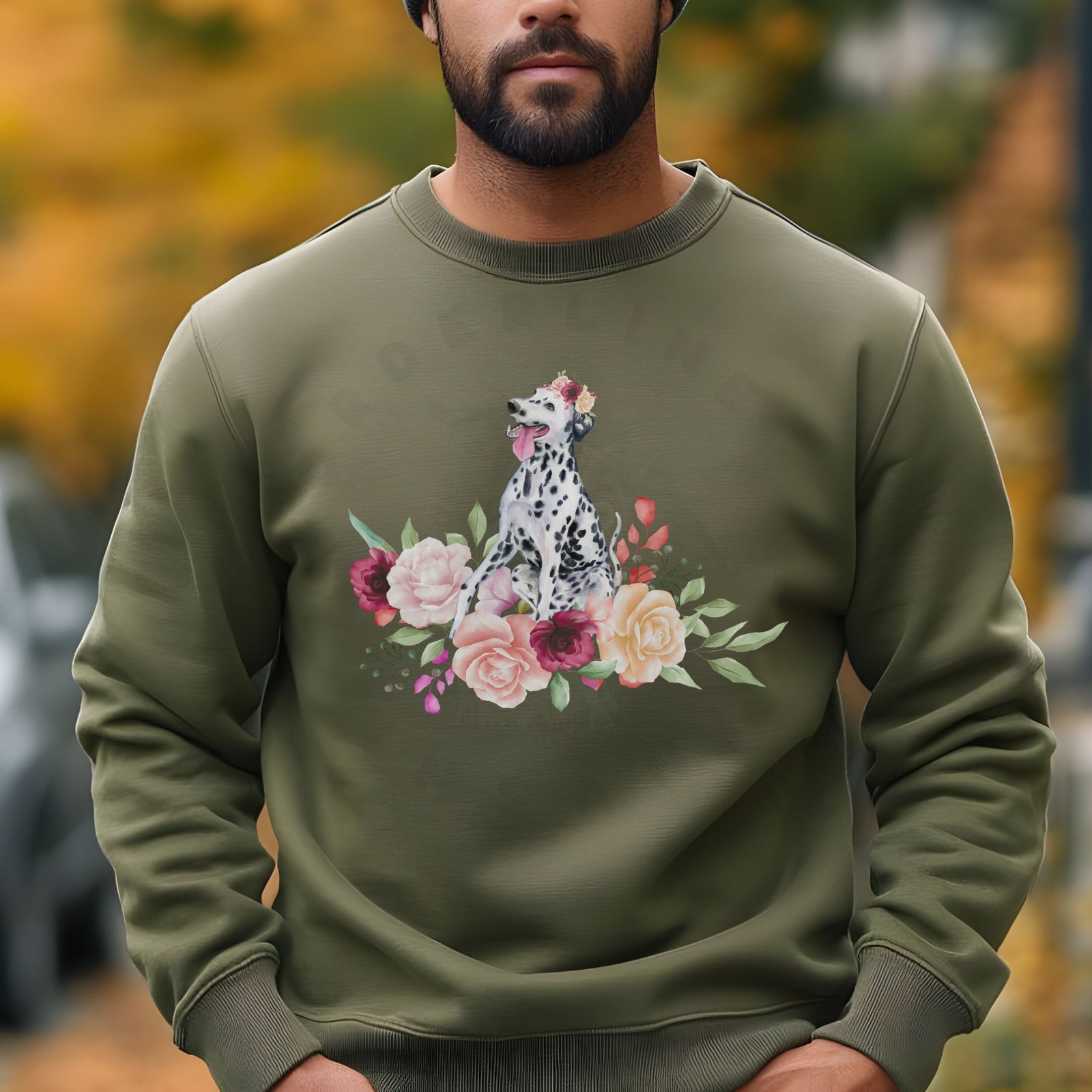 Stay cozy while celebrating your spotted Dalmatian with this stunning watercolor design! This beautiful crewneck sweatshirt features a gorgeous Dalmatian portrait with their iconic black spots and happy expression, surrounded by soft blooms in pink, coral, burgundy, and peach tones. The artistic watercolor style captures the joyful, energetic spirit that makes Dalmatians so beloved, while the abundant floral arrangement adds elegance and charm to this distinctive breed.
