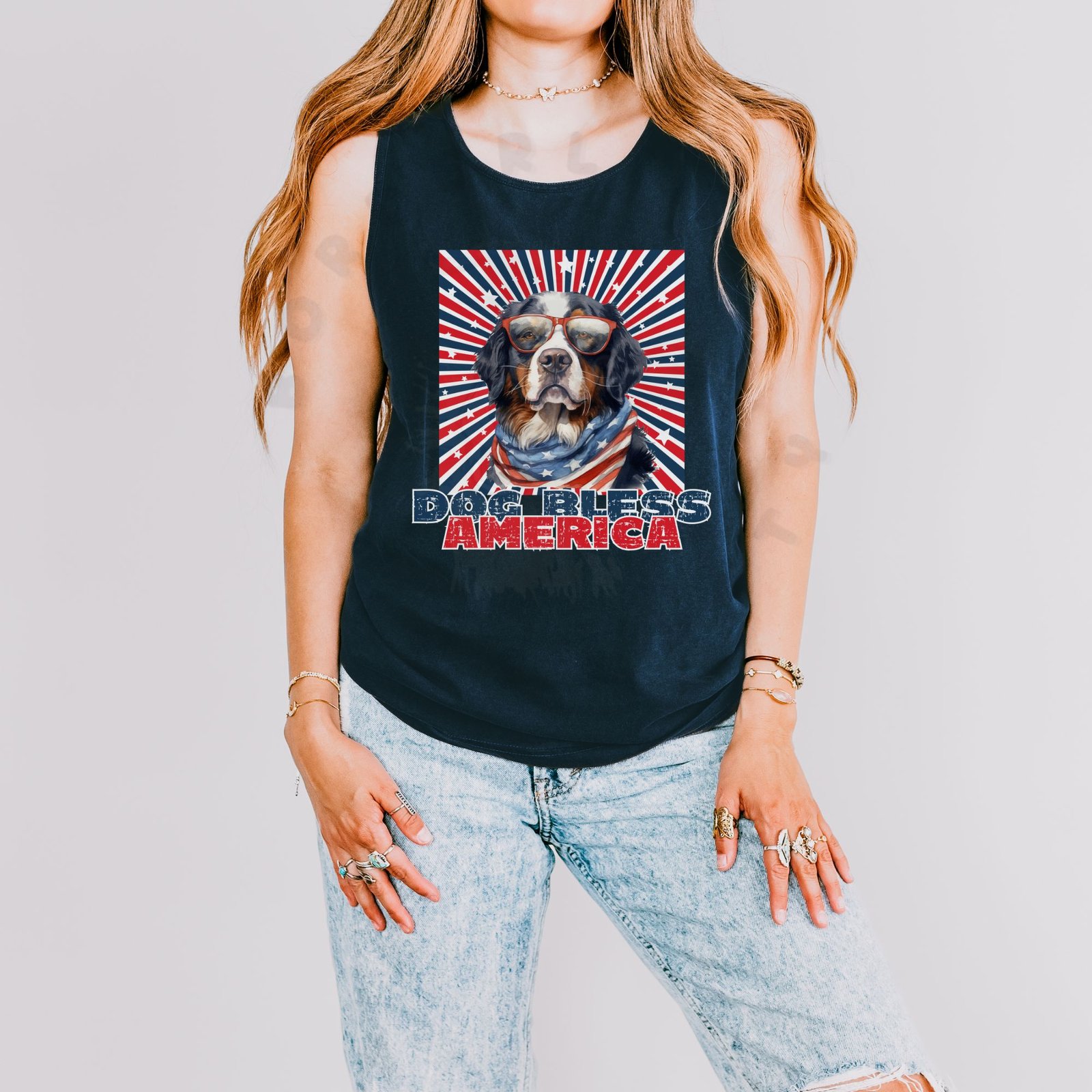 Design Details: Your Bernese Mountain Dog rocks sunglasses and an American flag bandana on this cool garment-dyed tank! The dynamic starburst background in patriotic colors with scattered stars creates a bold impact. The distressed “DOG BLESS AMERICA” text adds vintage Americana charm. The style is perfect for staying cool during hot summer celebrations!