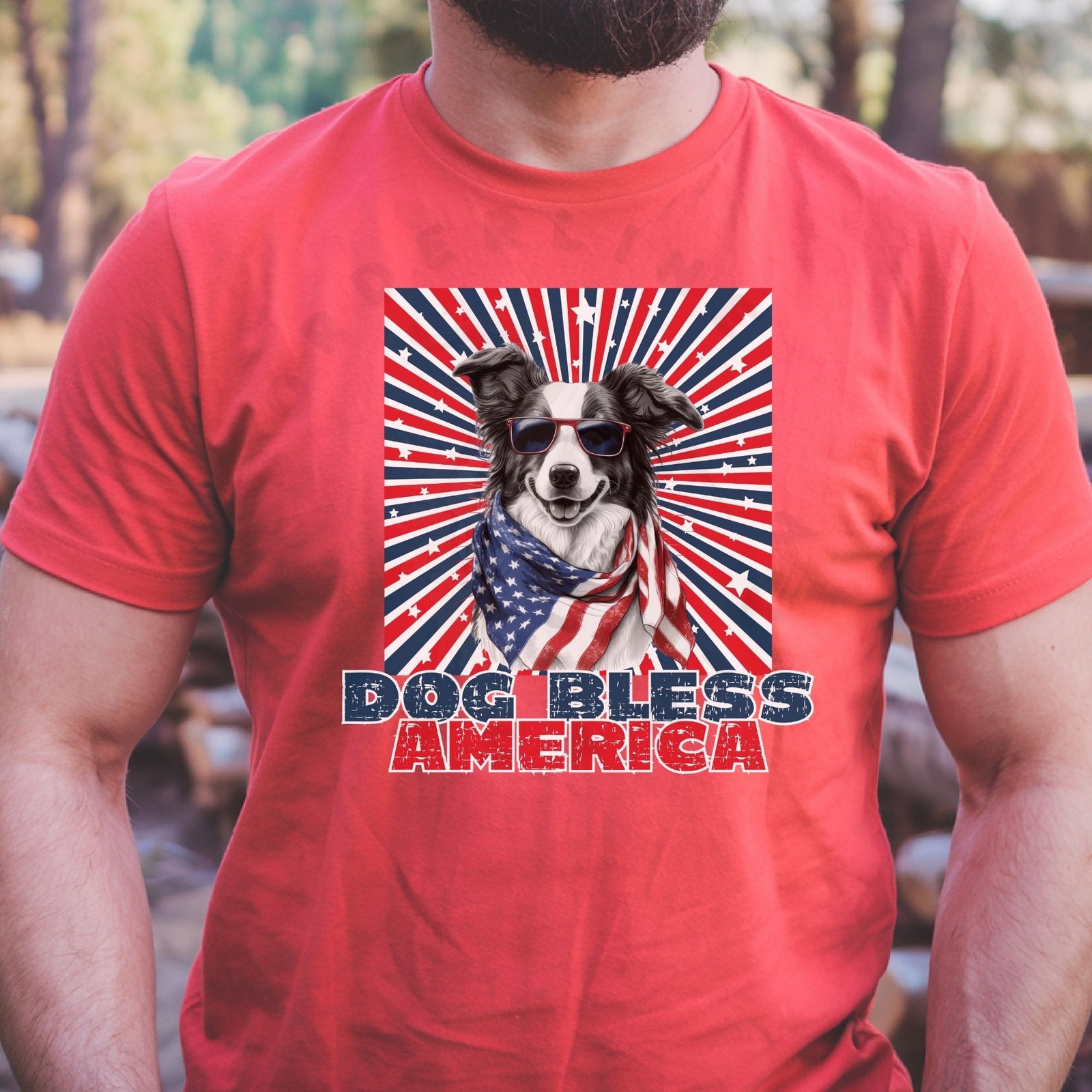 Design Details: Your Border Collie looks cool and patriotic wearing sunglasses with a flowing American flag bandana! The dynamic starburst background in red, white, and blue with scattered stars creates a bold visual impact. The distressed “DOG BLESS AMERICA” text adds vintage Americana style.
