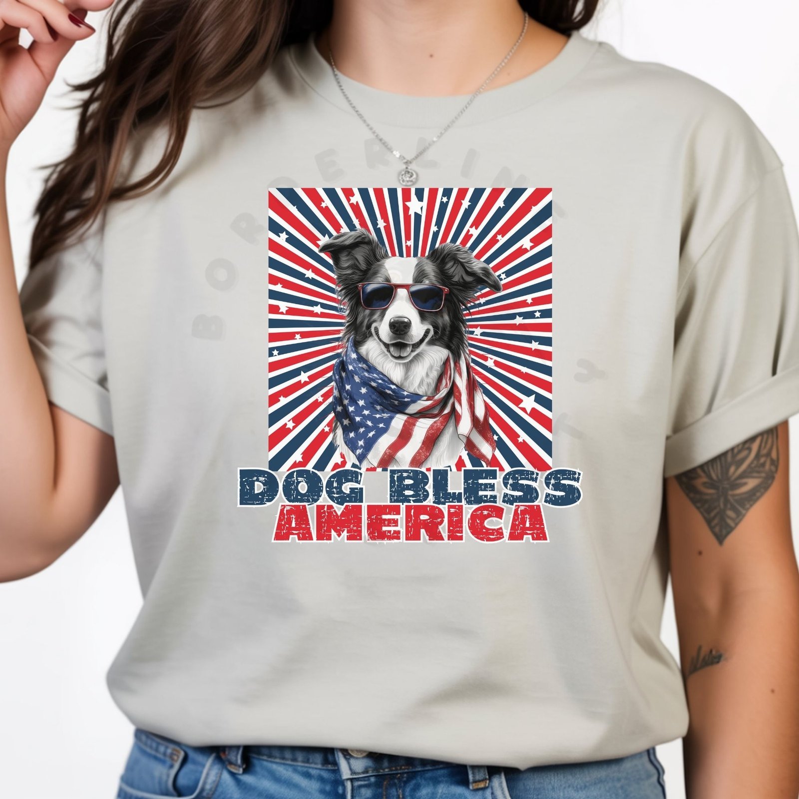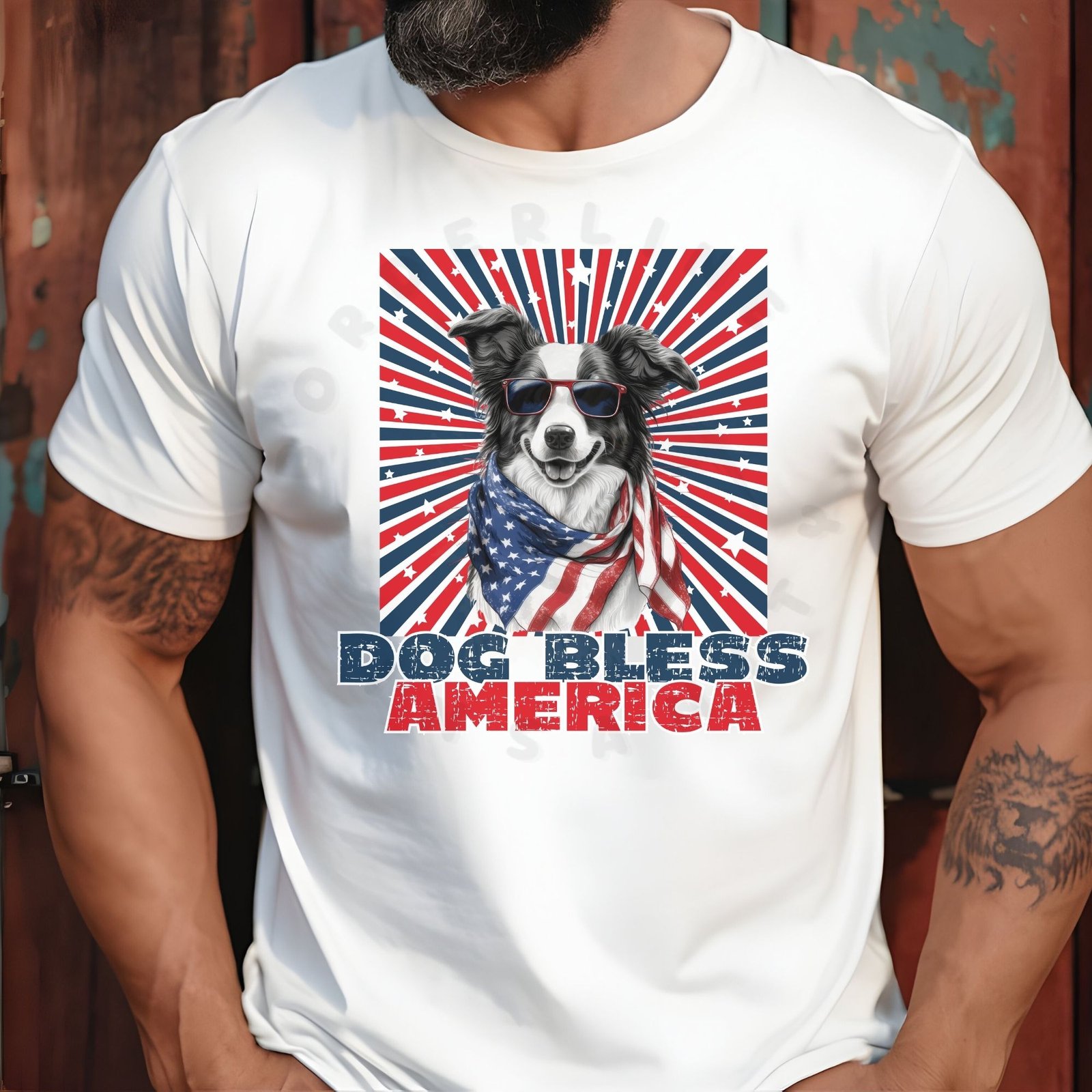 - Bold “DOG BLESS AMERICA” patriotic statement