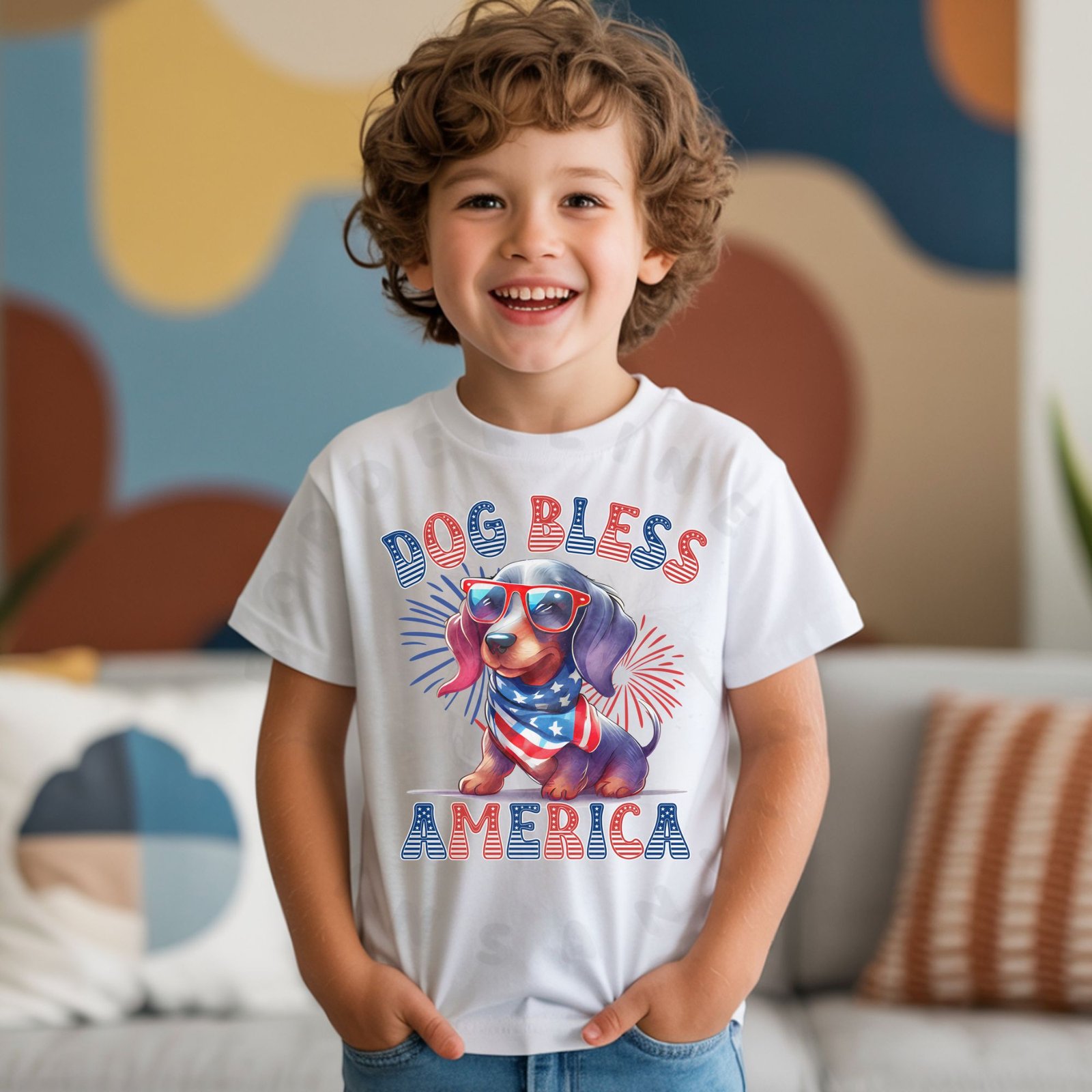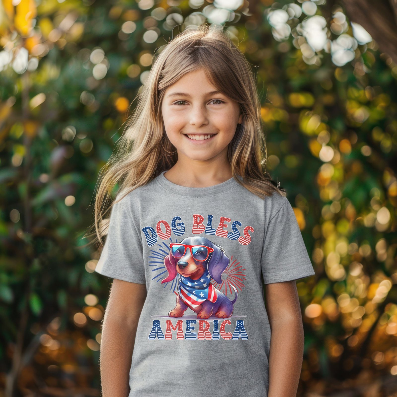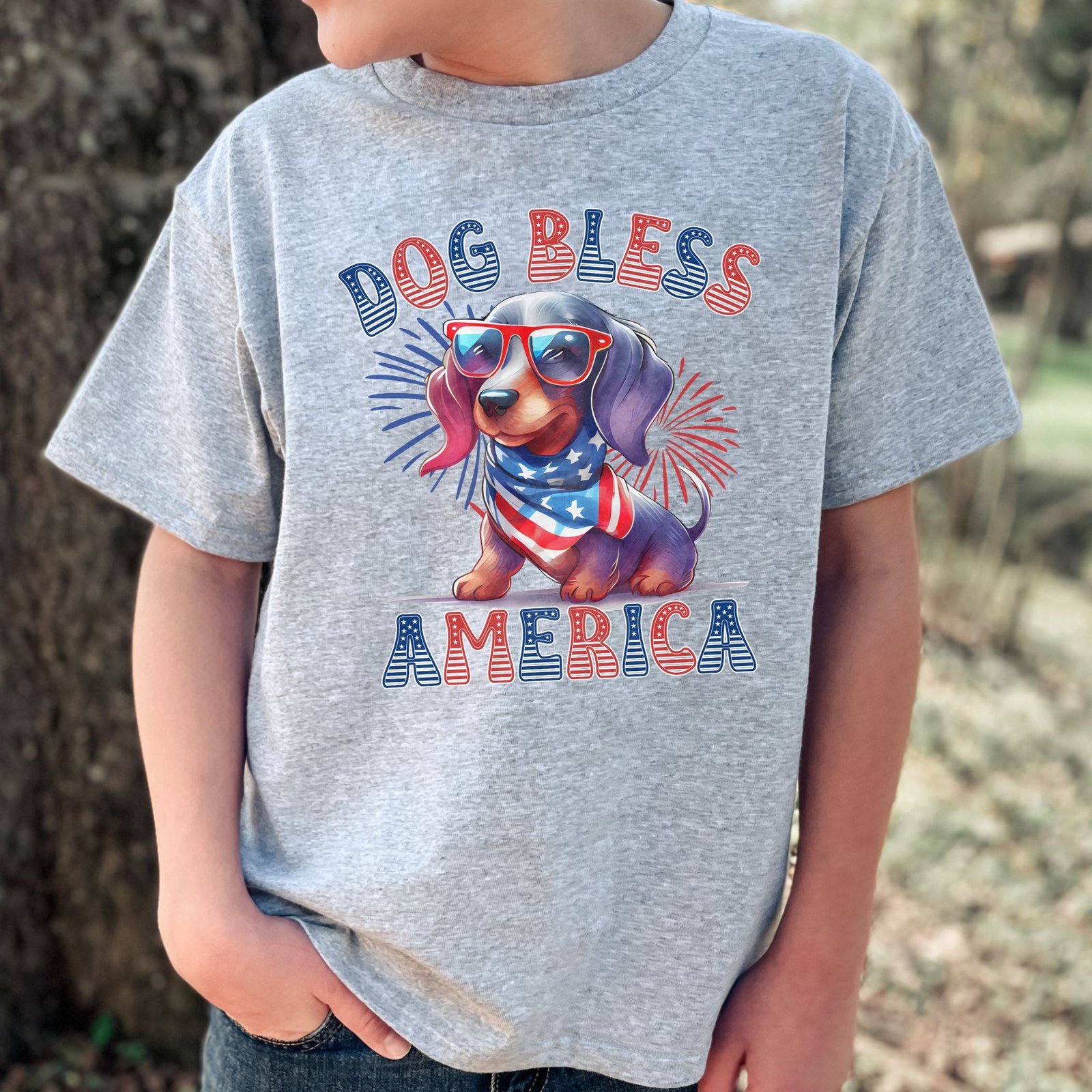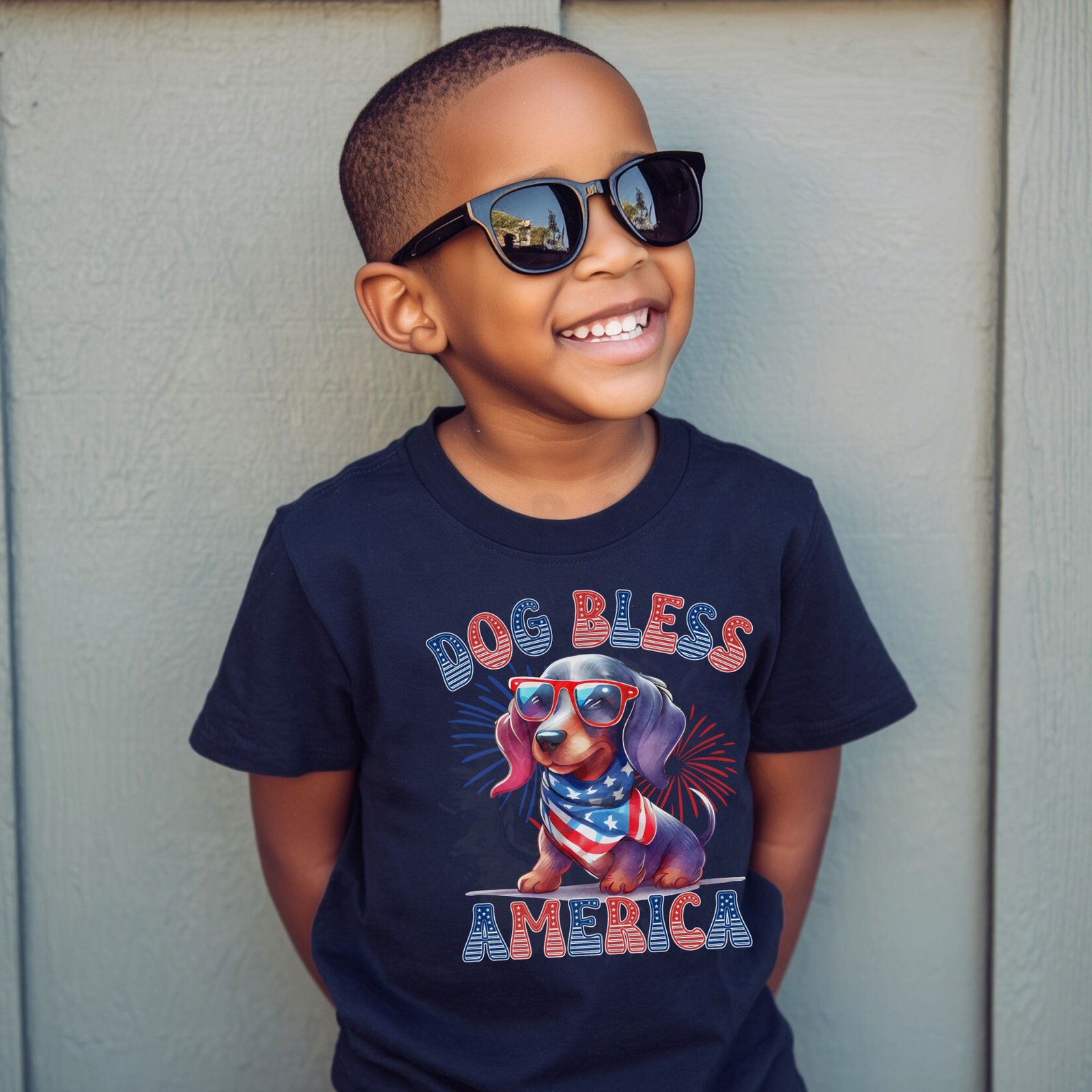 Celebrate America with your favorite Dachshund! This fun “DOG BLESS AMERICA” kids shirt features an adorable Dachshund puppy wearing patriotic sunglasses and an American flag bandana against a vibrant red, white, and blue starburst background. Perfect for 4th of July celebrations, Memorial Day BBQs, Veterans Day events, and showing patriotic Dachshund pride all year!