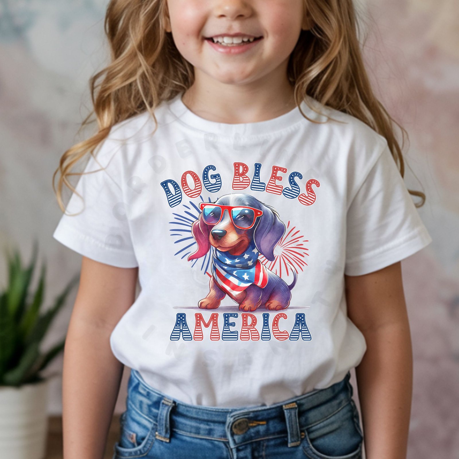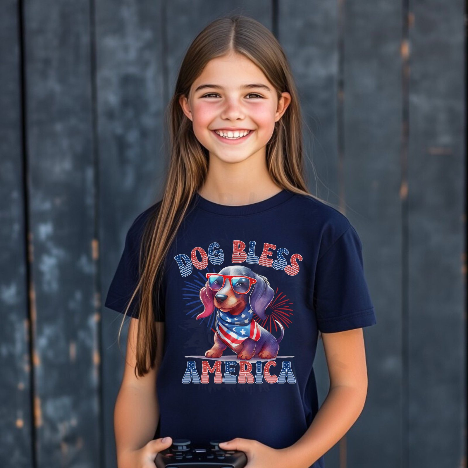 - Bold “DOG BLESS AMERICA” patriotic statement