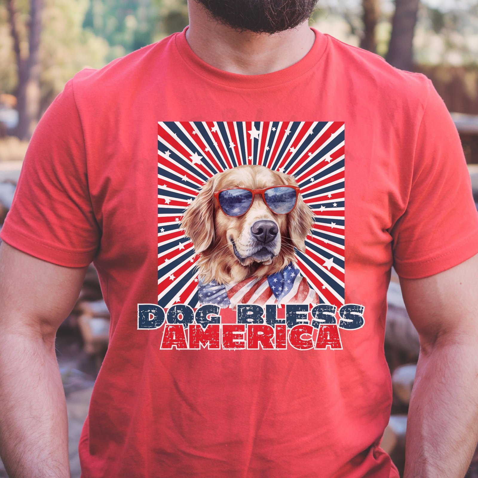 Design Details: Your Golden Retriever looks cool and patriotic wearing sunglasses with a flowing American flag bandana! The dynamic starburst background in red, white, and blue with scattered stars creates a bold visual impact. The distressed “DOG BLESS AMERICA” text adds vintage Americana style.