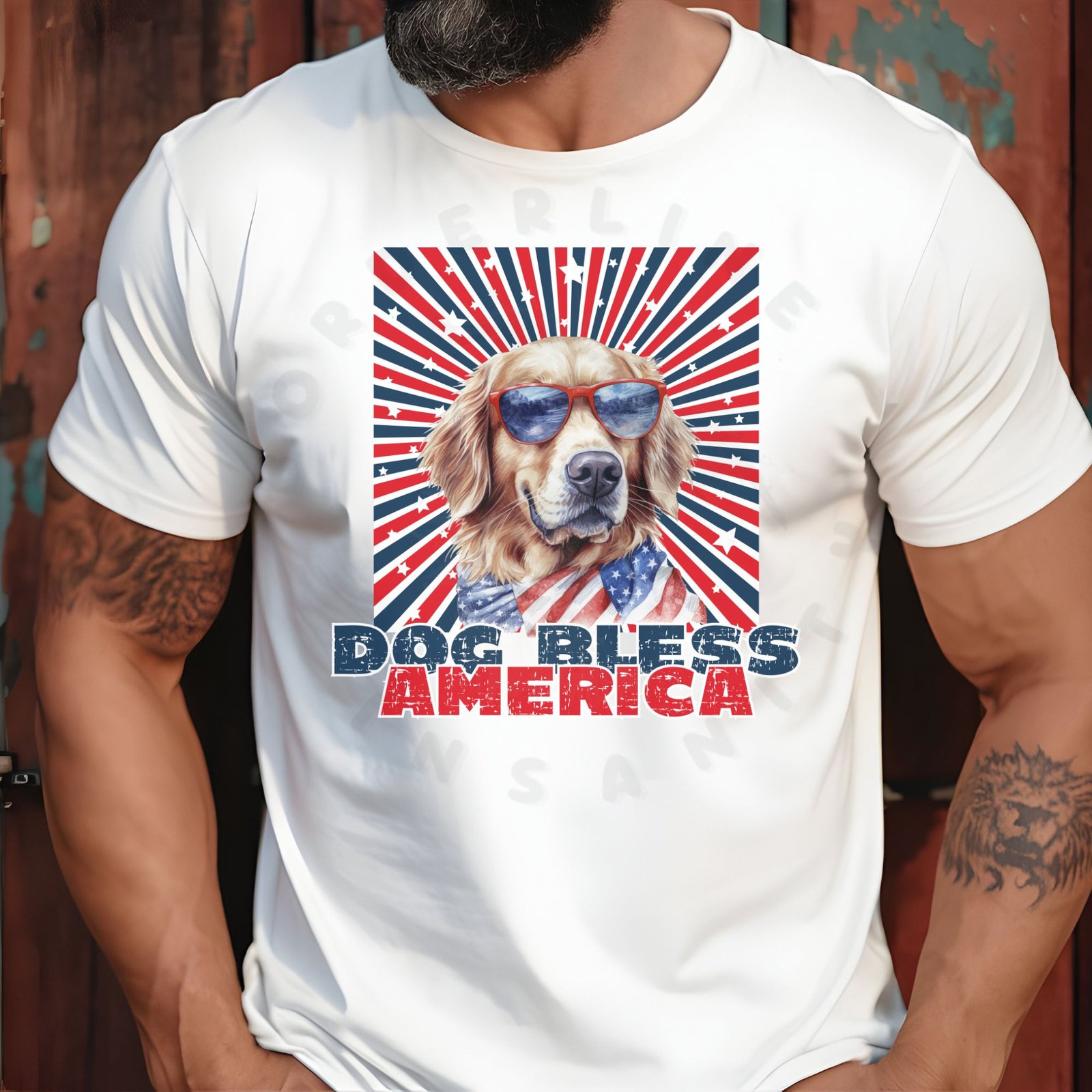 • Bold “DOG BLESS AMERICA” patriotic statement