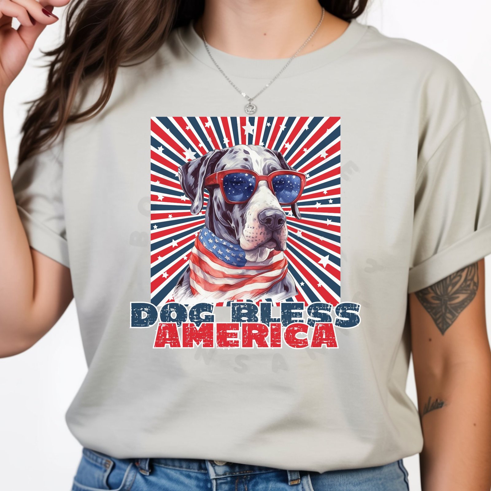 Bold “Dog Bless America” Great Dane shirt! Cool Great Dane in sunglasses with an American flag bandana on red, white, and blue starburst. Perfect for 4th of July, Memorial Day, Veterans Day, and patriotic celebrations!