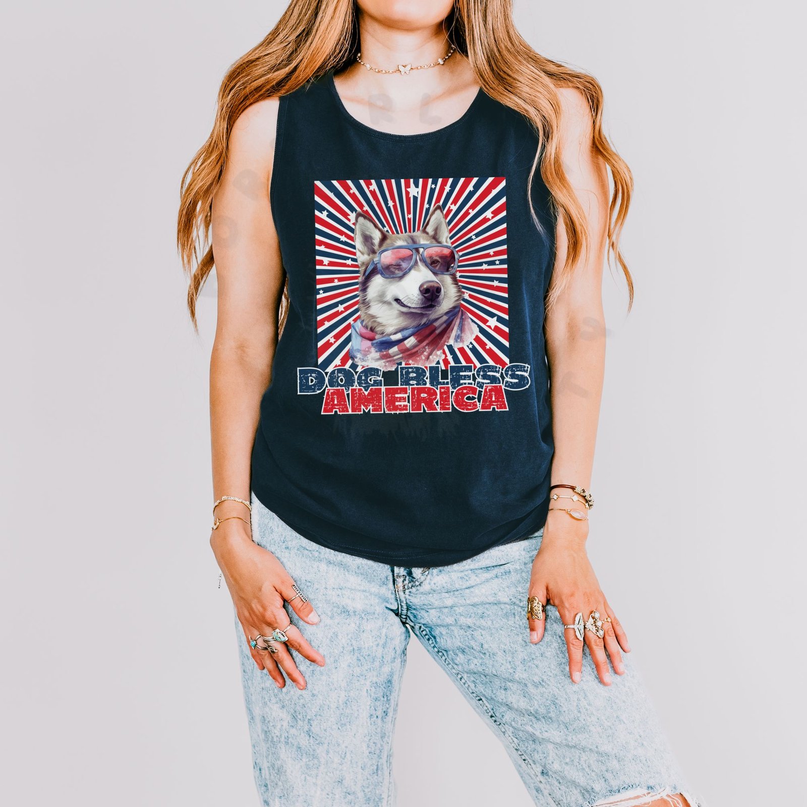 Celebrate America in style with your Husky! This bold “DOG BLESS AMERICA” garment-dyed tank features a cool Husky wearing patriotic sunglasses and an American flag bandana against a vibrant red, white, and blue starburst background. Perfect for hot summer 4th of July celebrations, Memorial Day BBQs, and staying cool while showing your American pride!