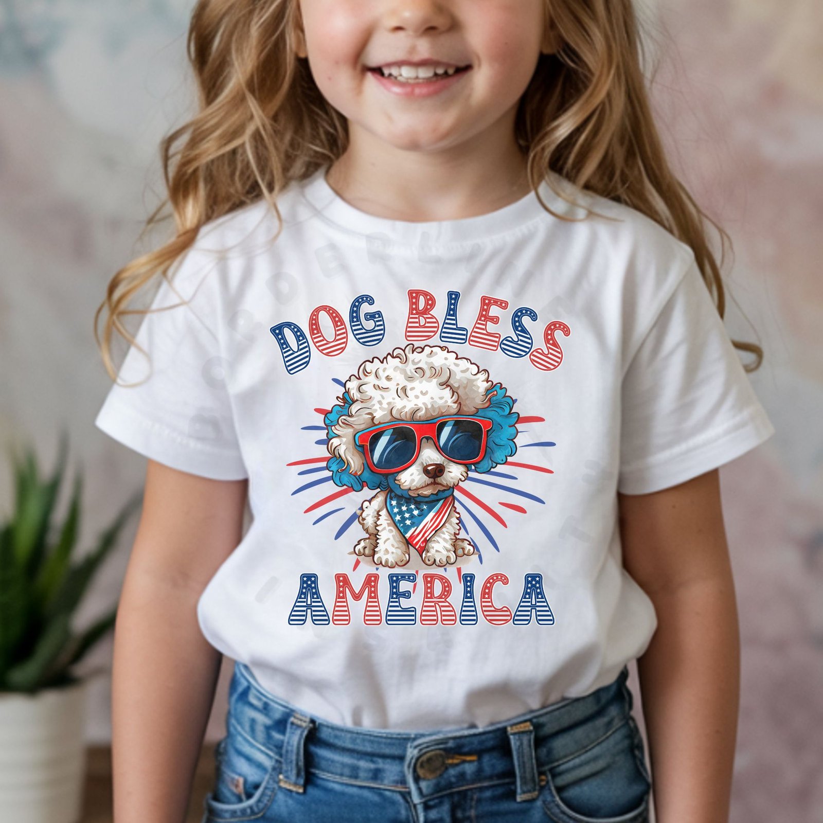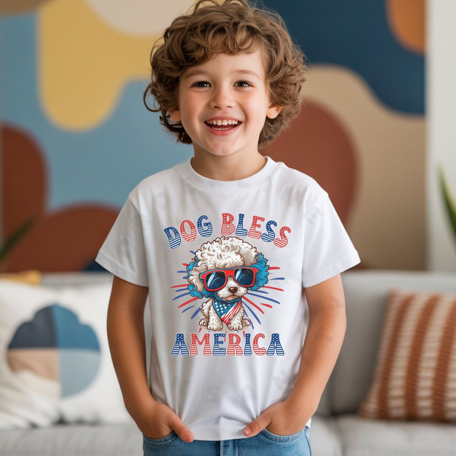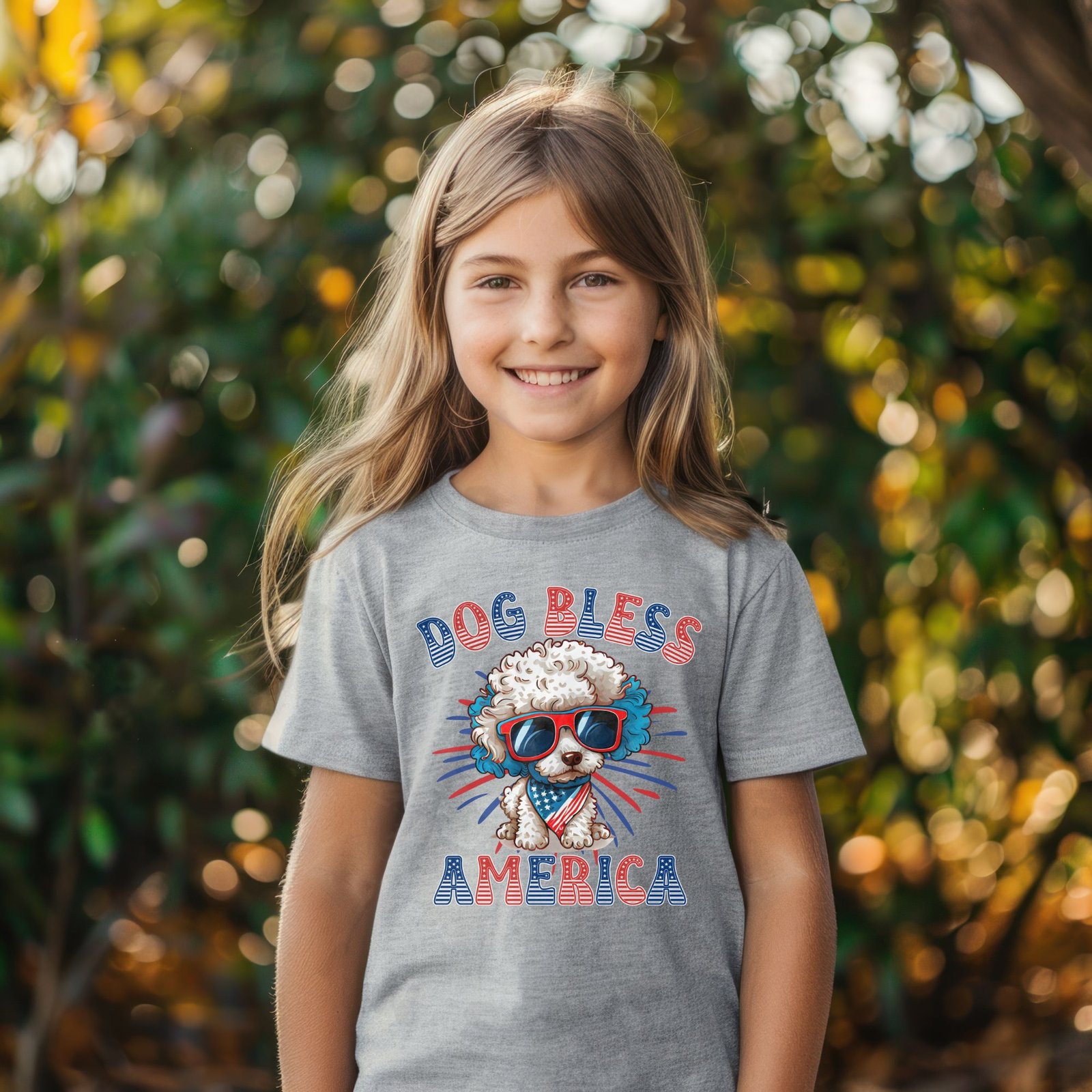 Celebrate America with your favorite Poodle! This fun “DOG BLESS AMERICA” kids shirt features an adorable Poodle puppy wearing patriotic sunglasses and an American flag bandana against a vibrant red, white, and blue starburst background. Perfect for 4th of July celebrations, Memorial Day BBQs, Veterans Day events, and showing patriotic Poodle pride all year!