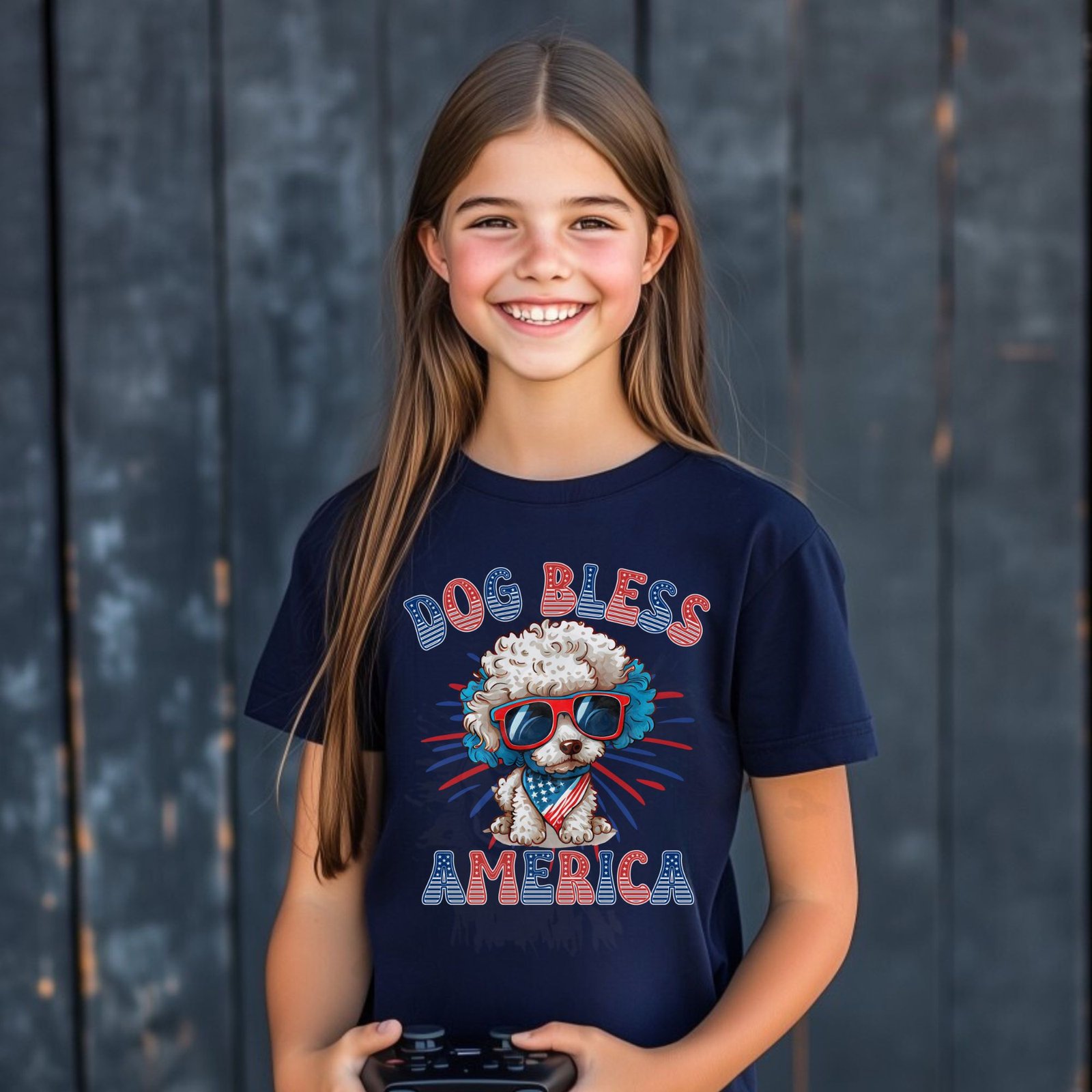 - Bold “DOG BLESS AMERICA” patriotic statement