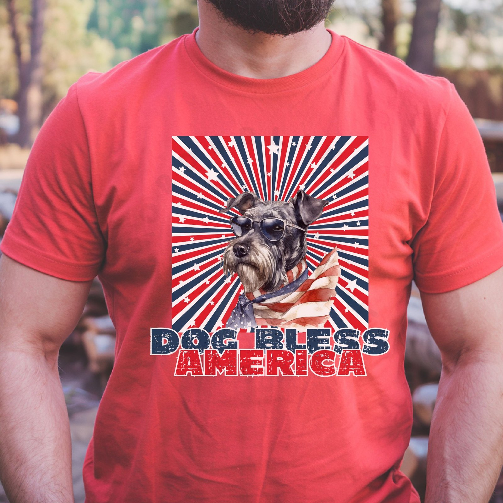 Design Details: Your Schnauzer looks cool and patriotic wearing sunglasses with a flowing American flag bandana! The dynamic starburst background in red, white, and blue with scattered stars creates a bold visual impact. The distressed “DOG BLESS AMERICA” text adds vintage Americana style.