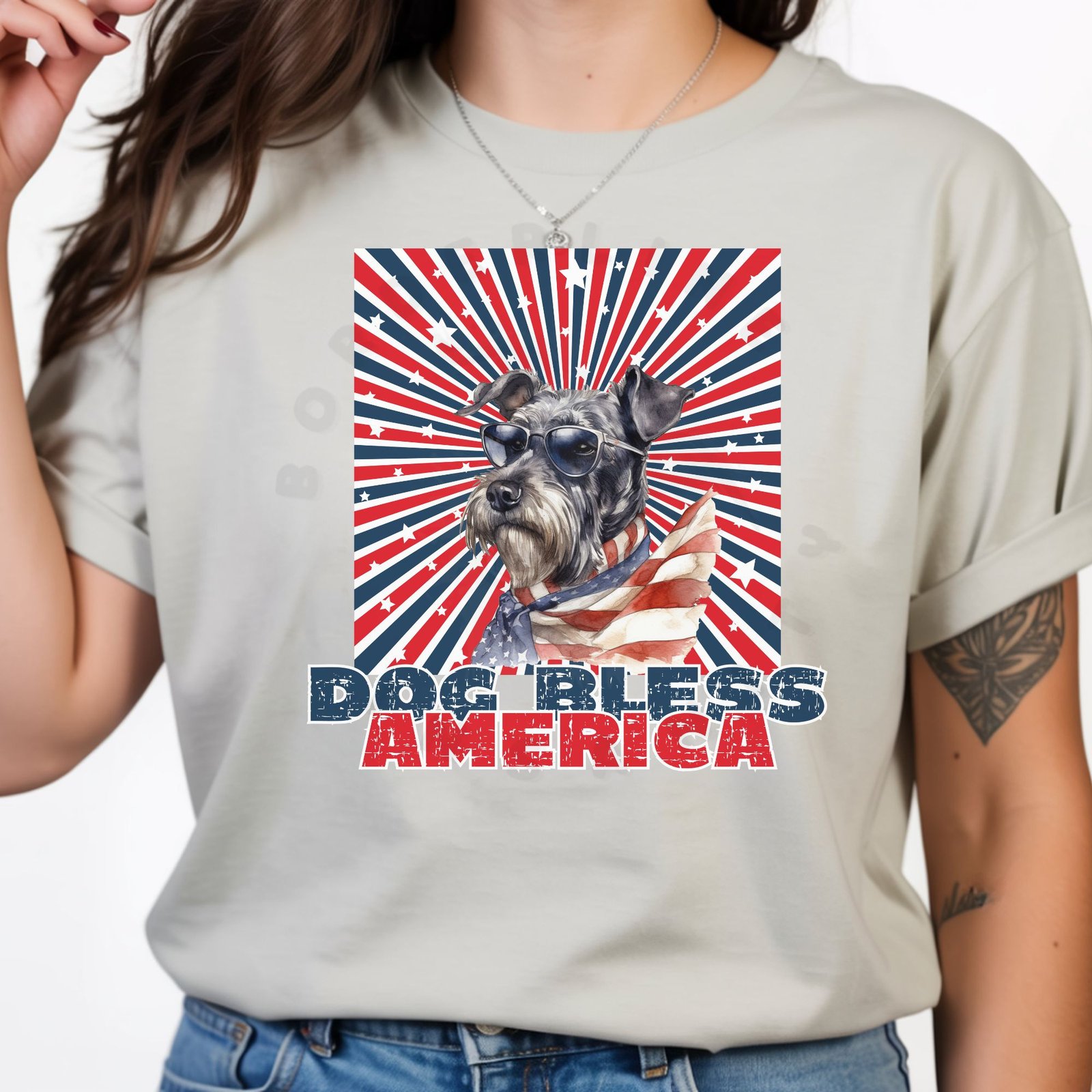 - Bold “DOG BLESS AMERICA” patriotic statement