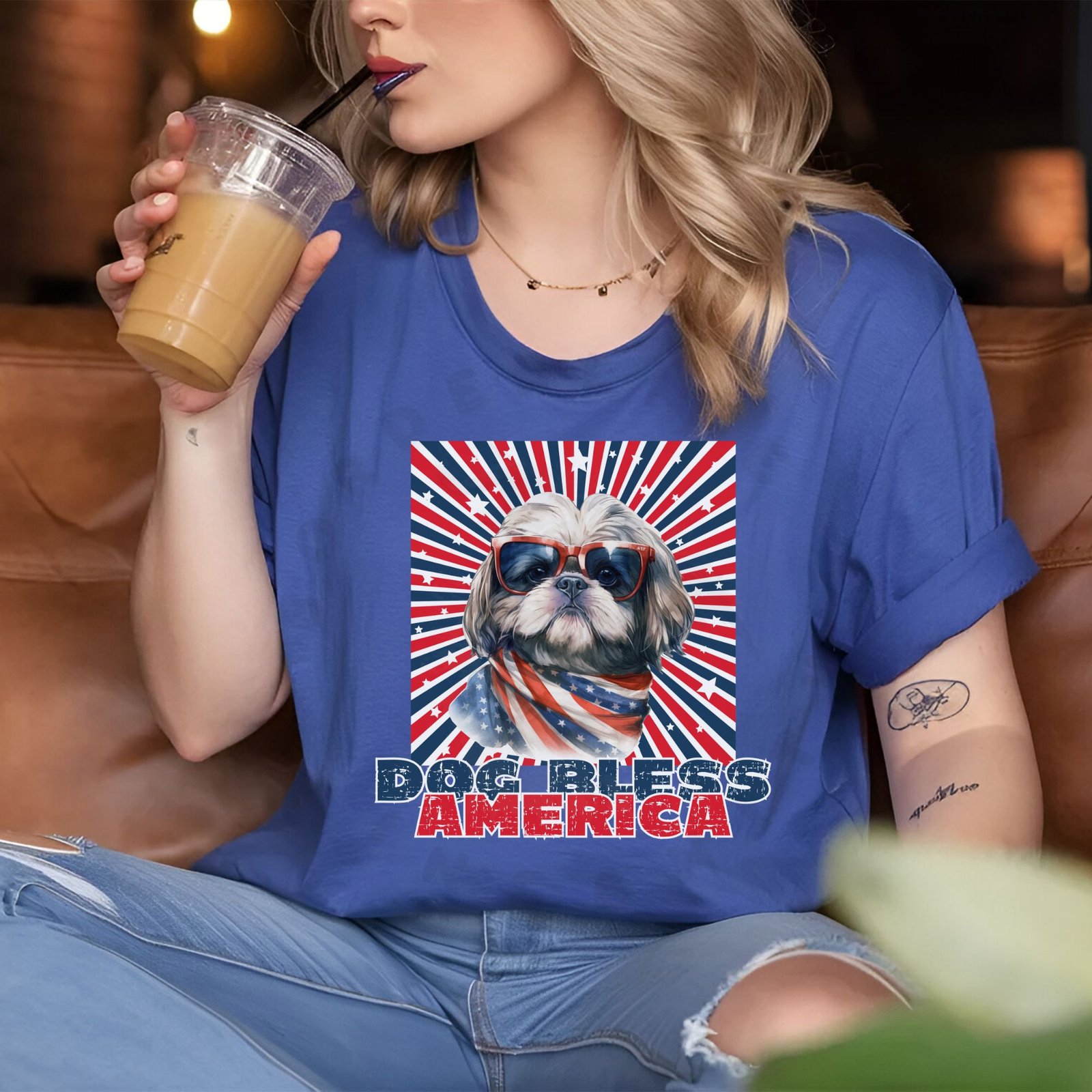 - Bold “DOG BLESS AMERICA” patriotic statement