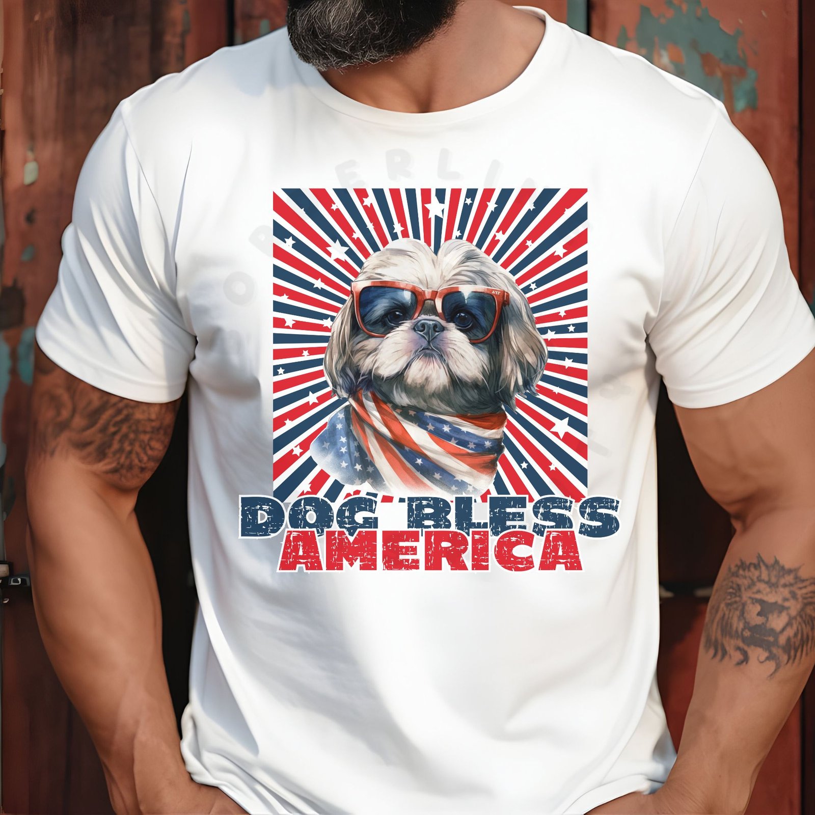 Design Details: Your Shih Tzu looks cool and patriotic wearing sunglasses with a flowing American flag bandana! The dynamic starburst background in red, white, and blue with scattered stars creates a bold visual impact. The distressed “DOG BLESS AMERICA” text adds vintage Americana style.