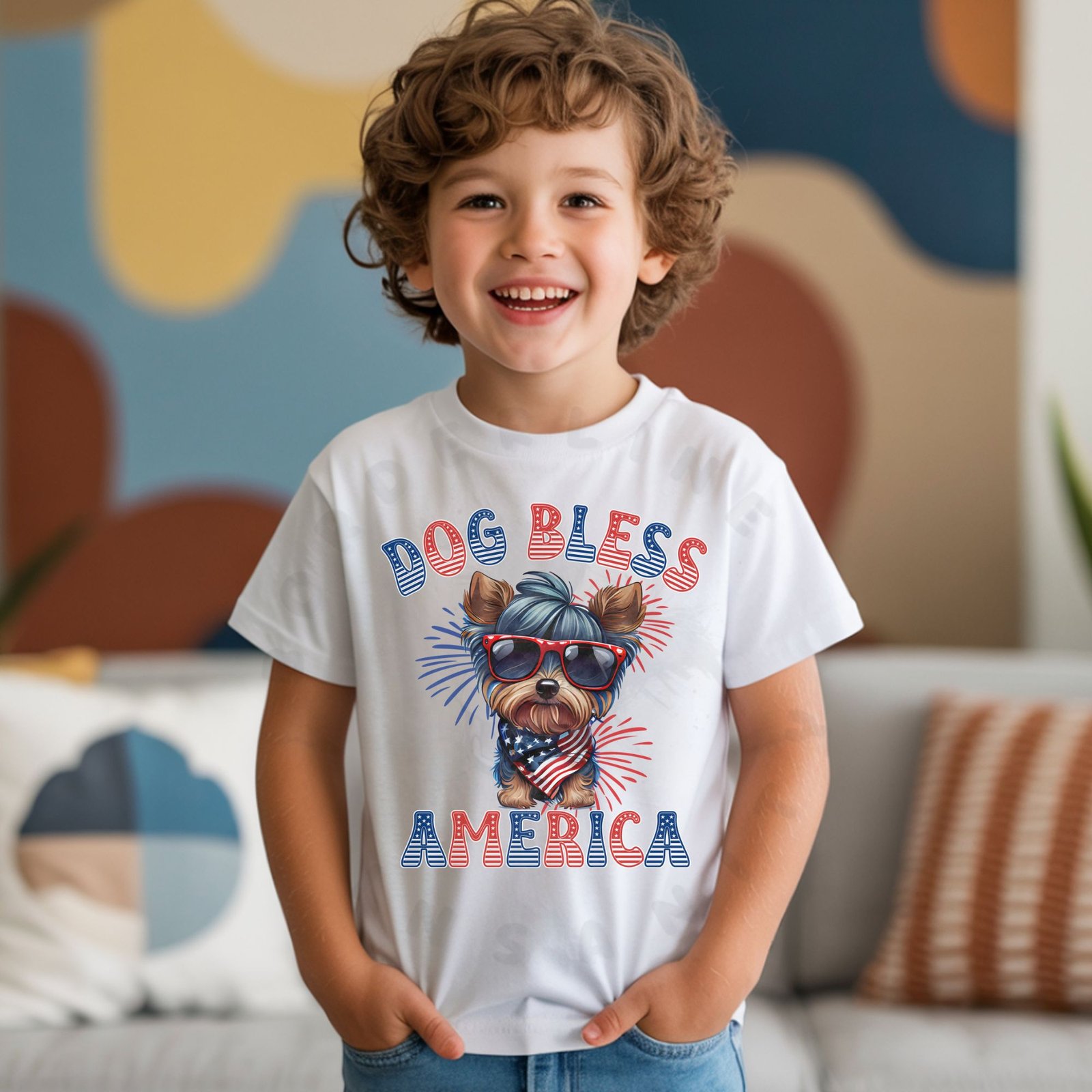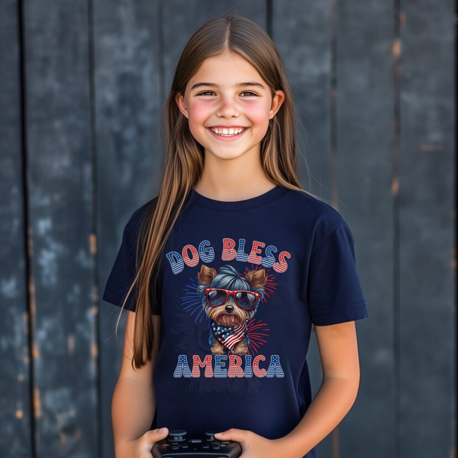 - Bold “DOG BLESS AMERICA” patriotic statement