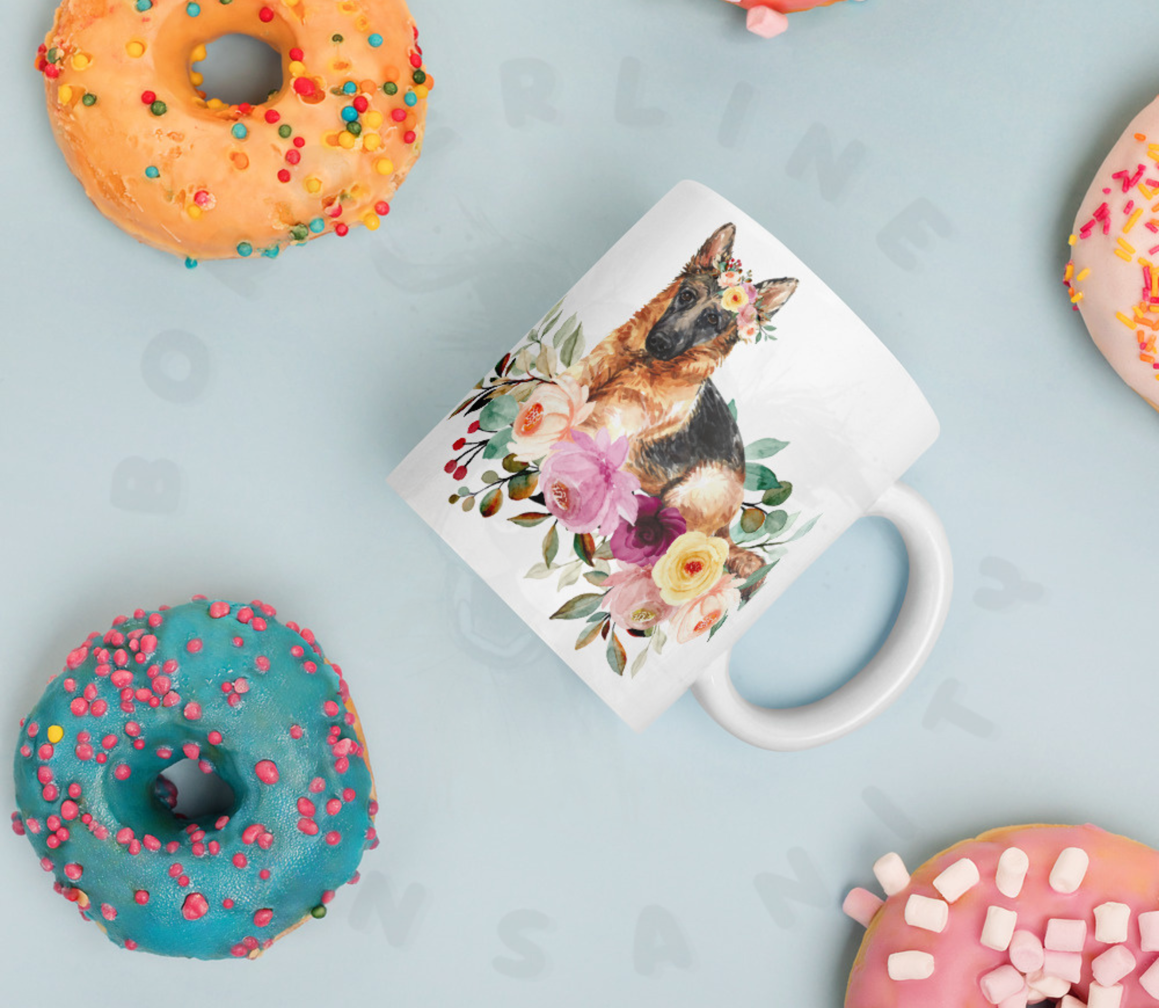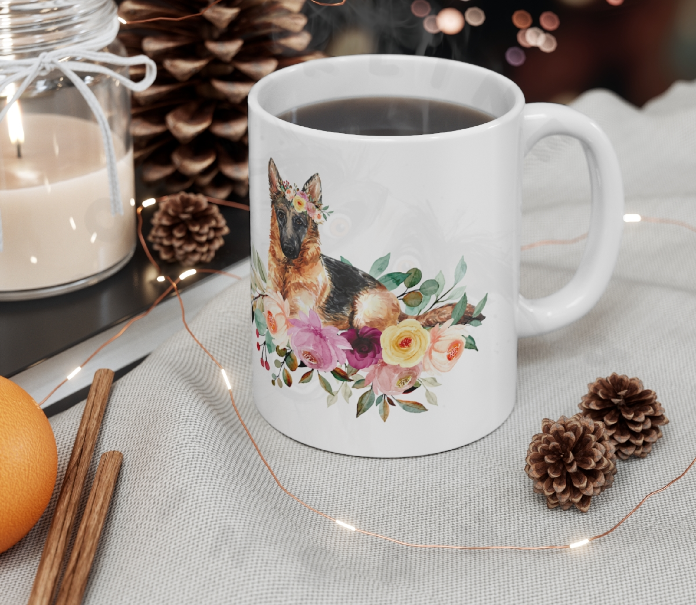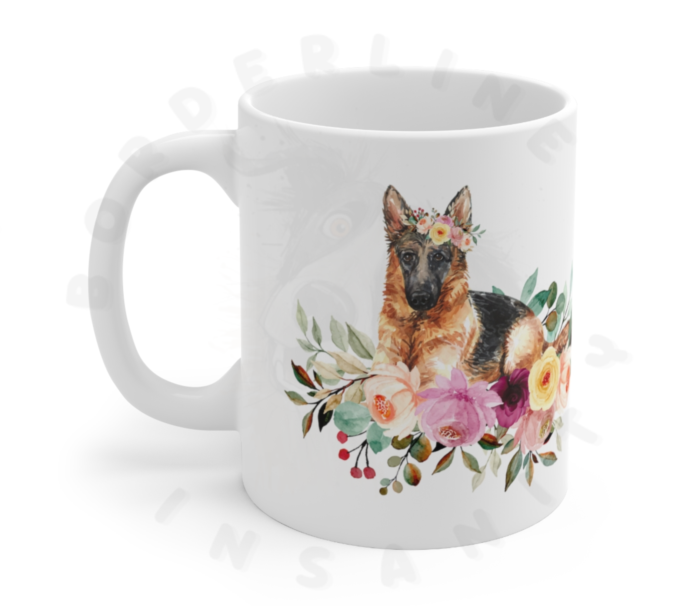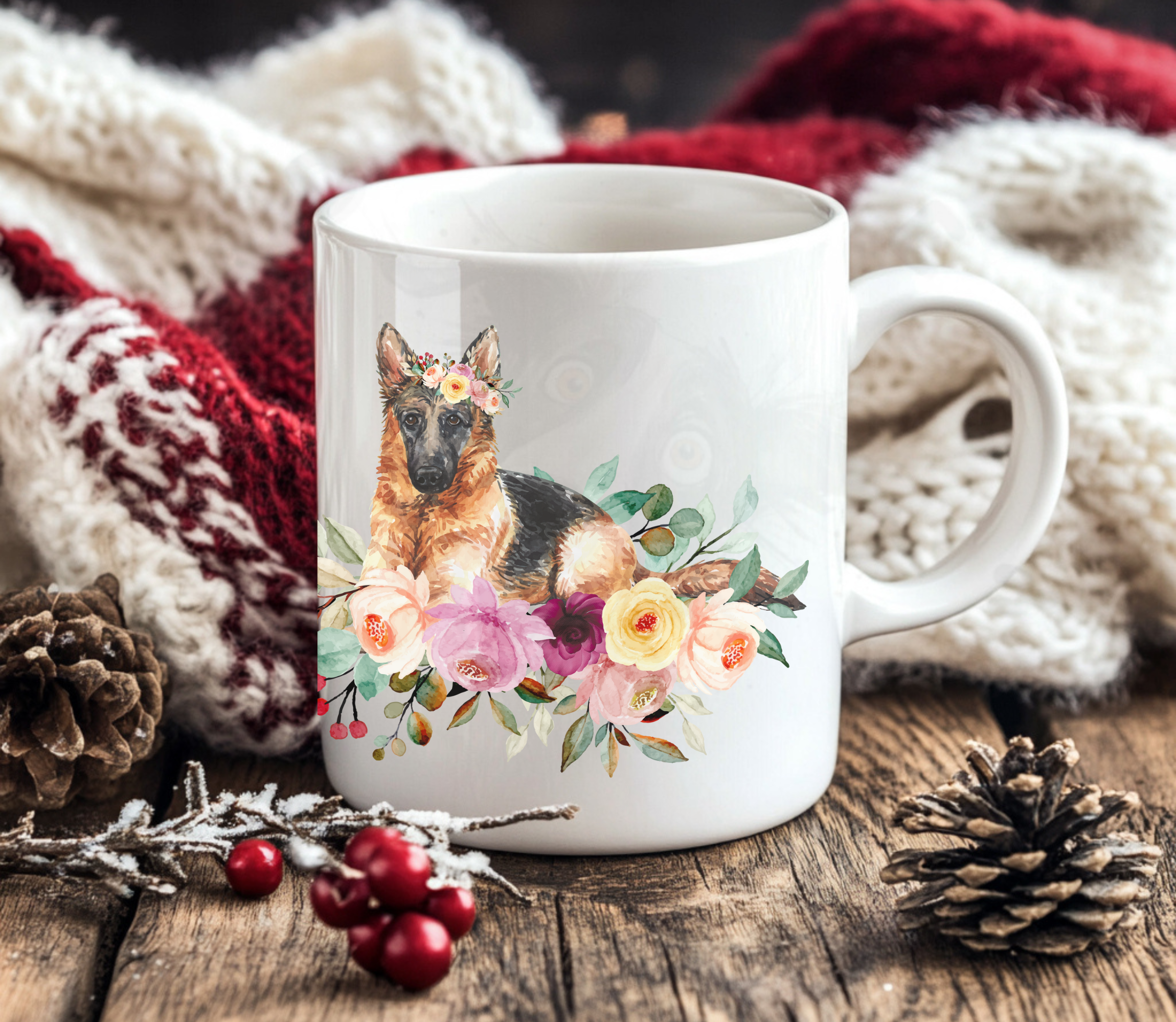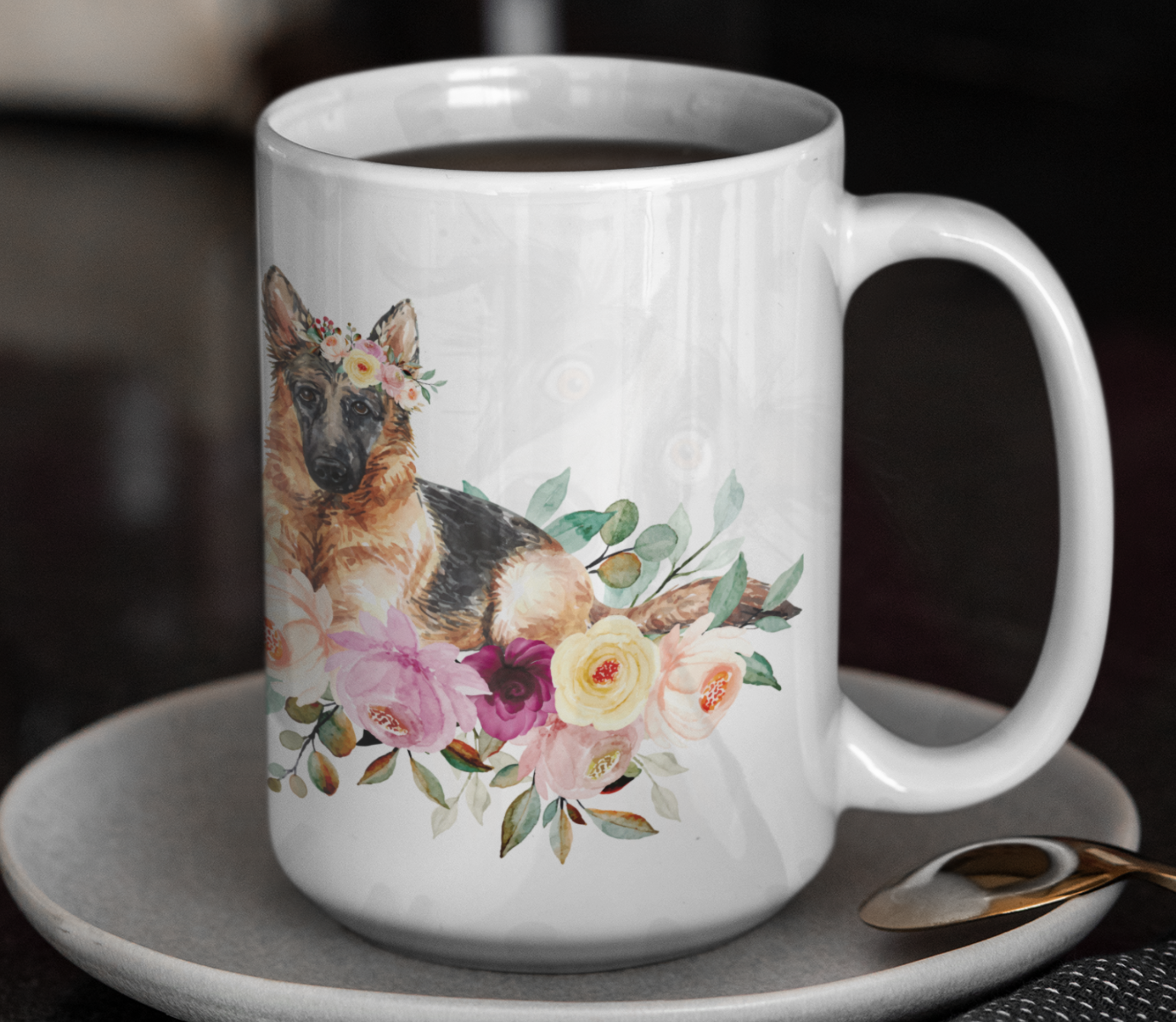Brighten your morning coffee with our enchanting German Shepherd floral mug!