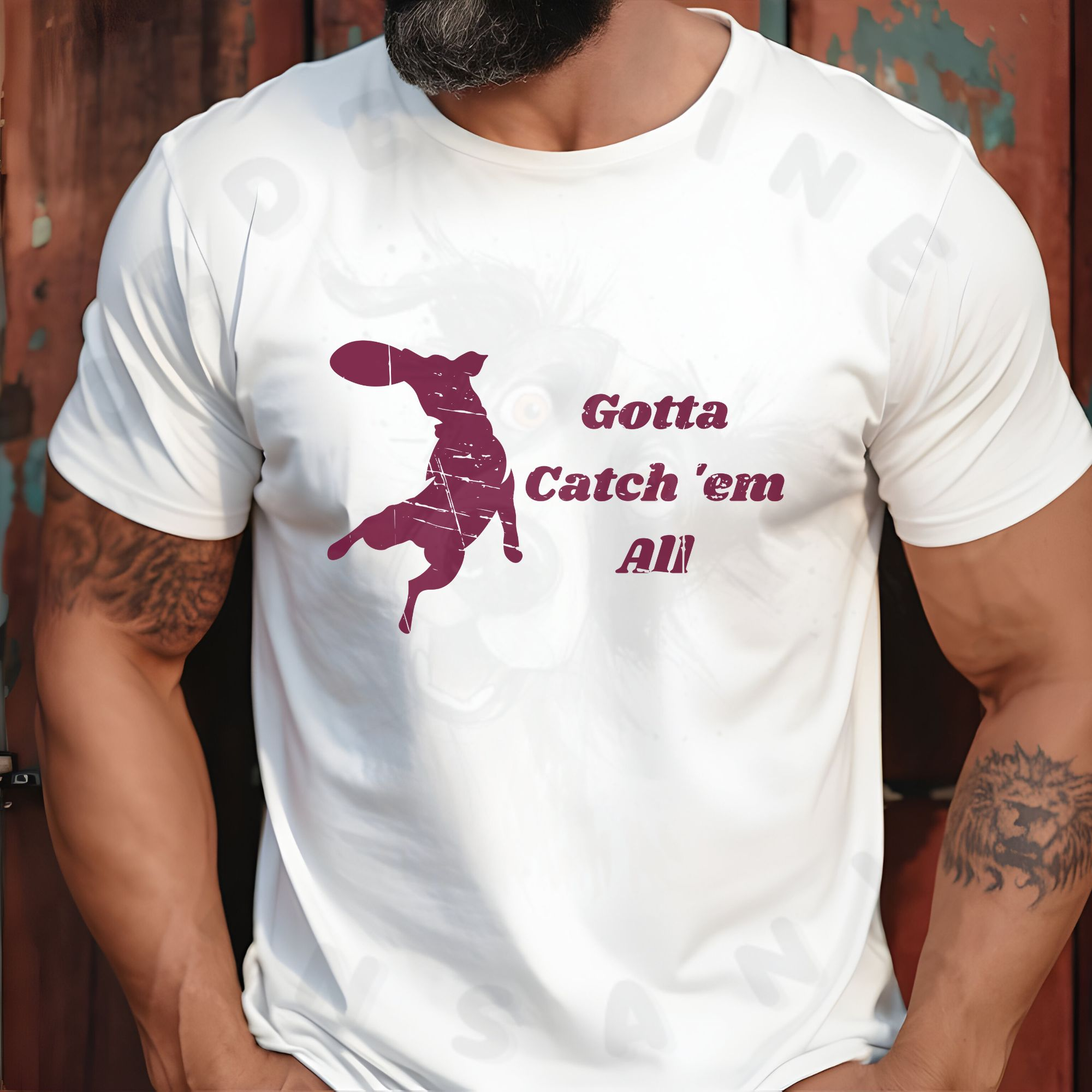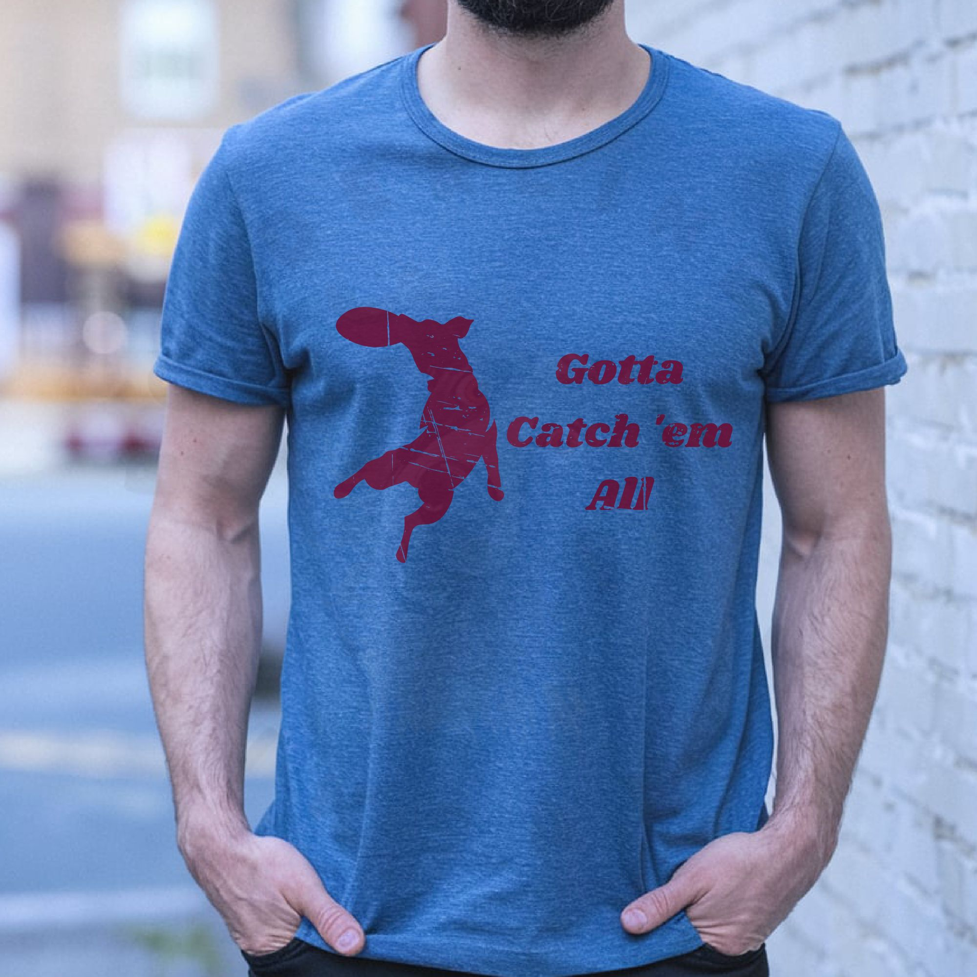 Celebrate disc dog with this “Gotta Catch ’Em All” t-shirt featuring a leaping dog catching a frisbee. Perfect for handlers, trainers, and canine sport fans.