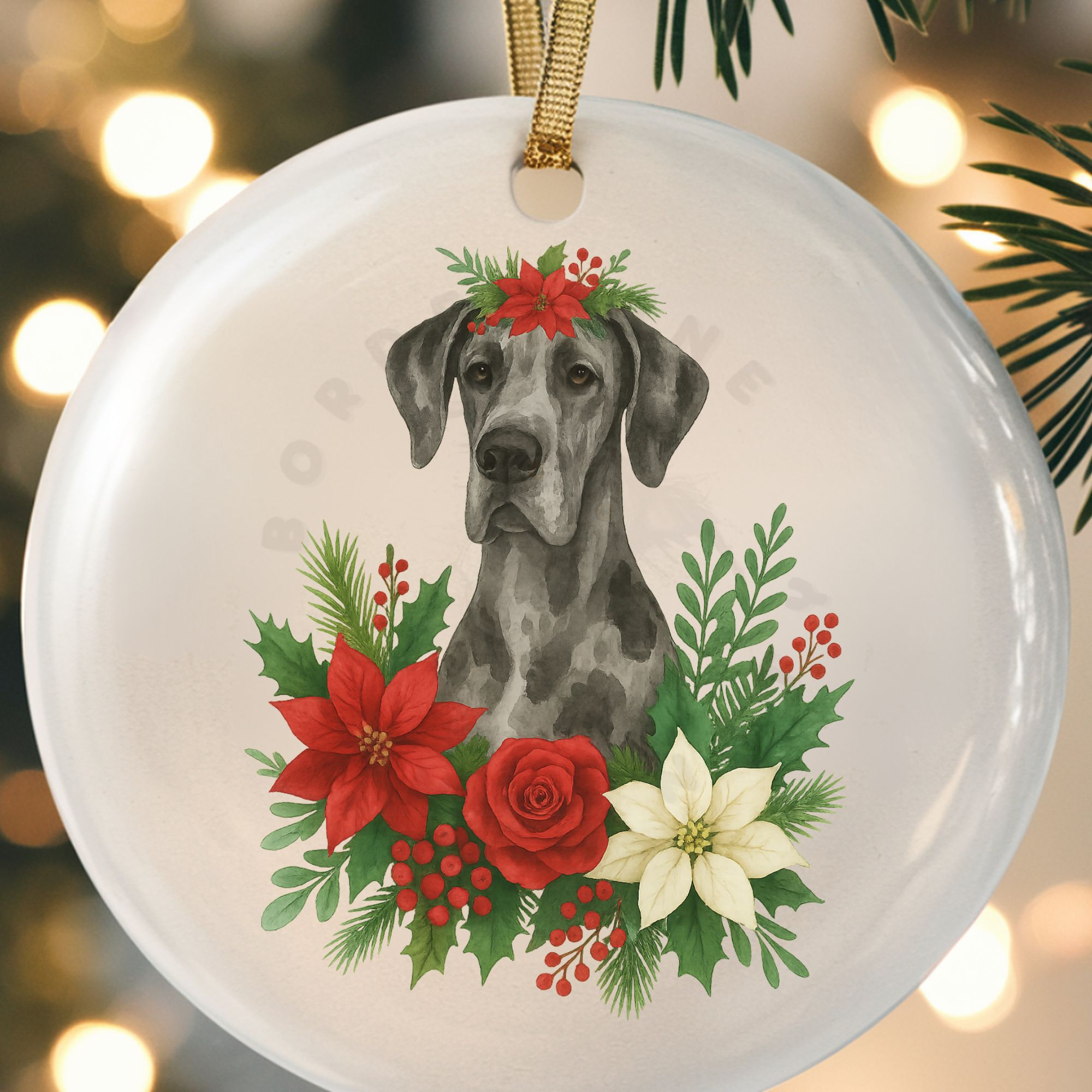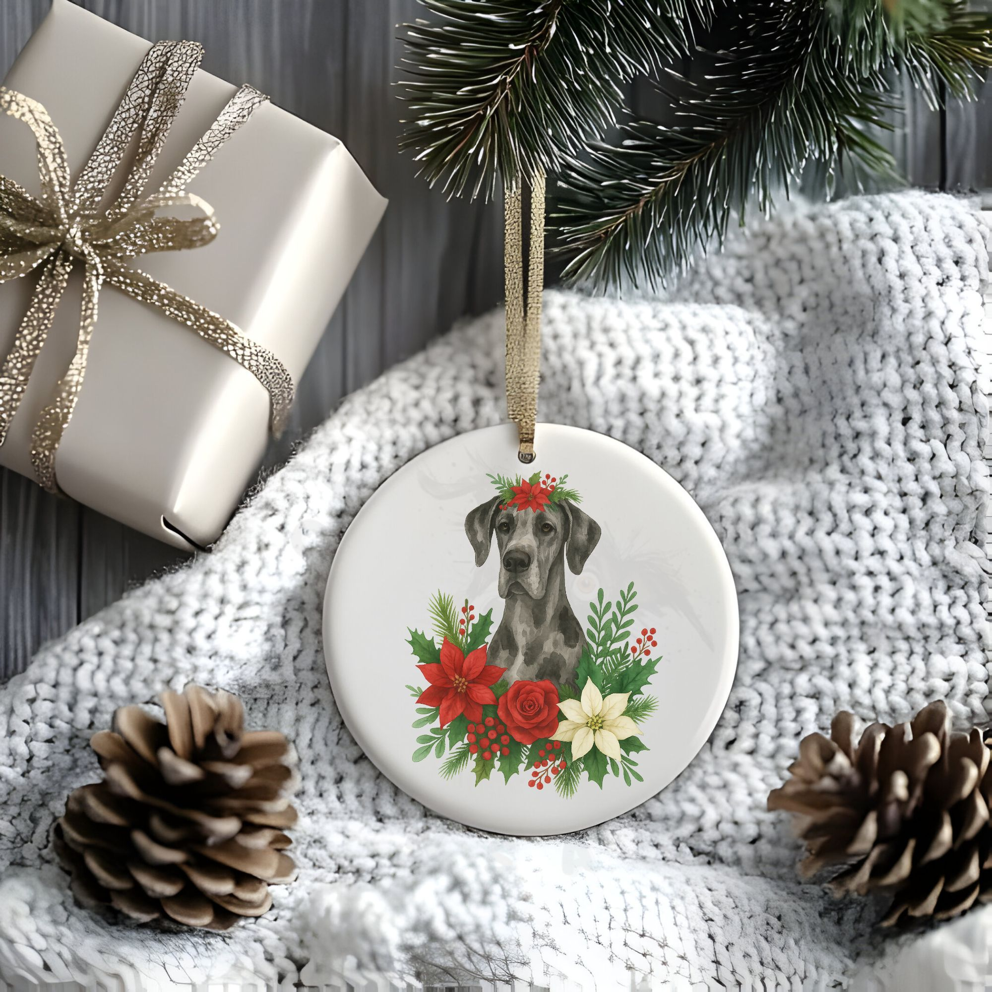Bring joy to your Christmas tree with this stunning Great Dane ornament, featuring a watercolor-style design surrounded by poinsettias and greenery.