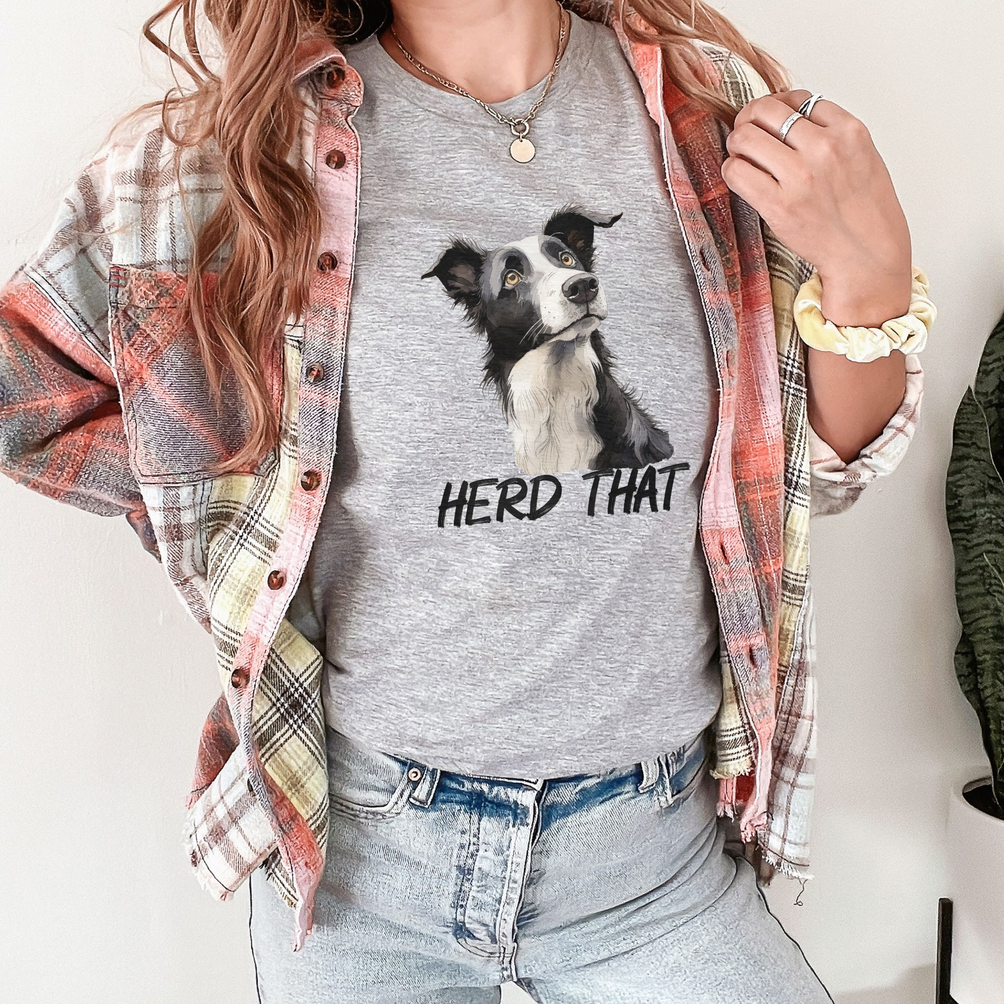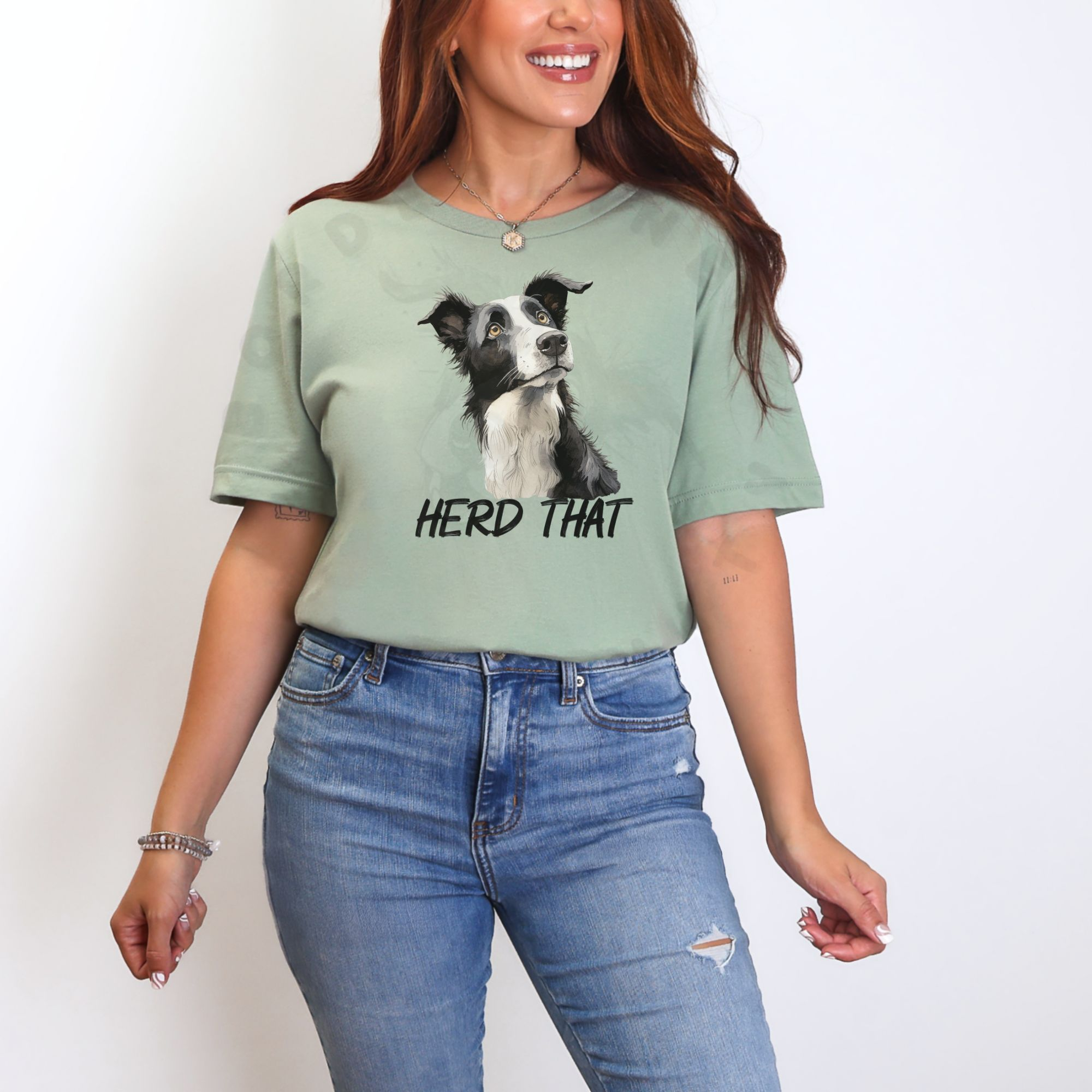 This hilarious Border Collie shirt features a charming watercolor-style Border Collie with an adorable head tilt and the clever phrase “Herd That” underneath.