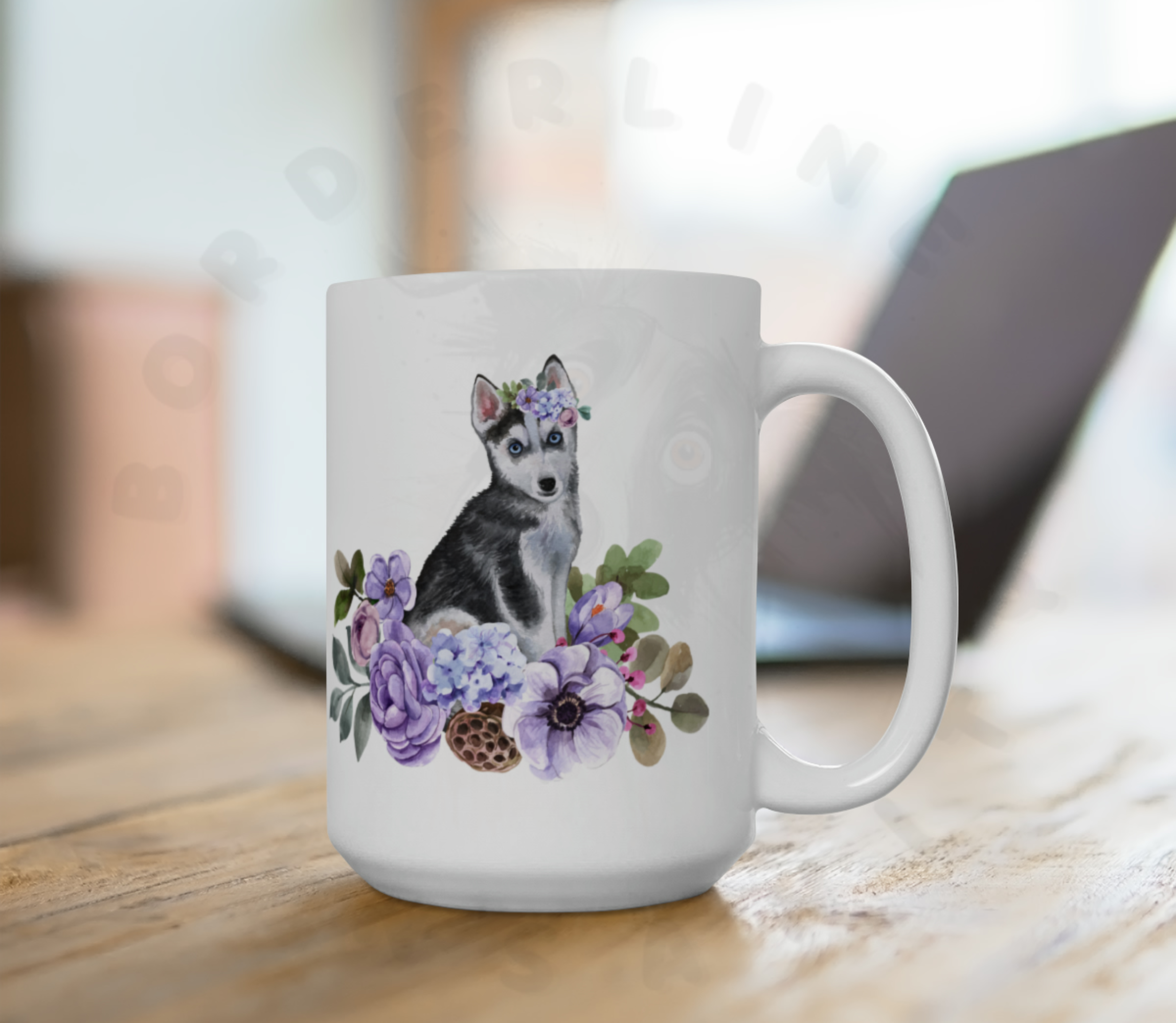 Brighten your morning coffee with our enchanting Husky Puppy floral mug!