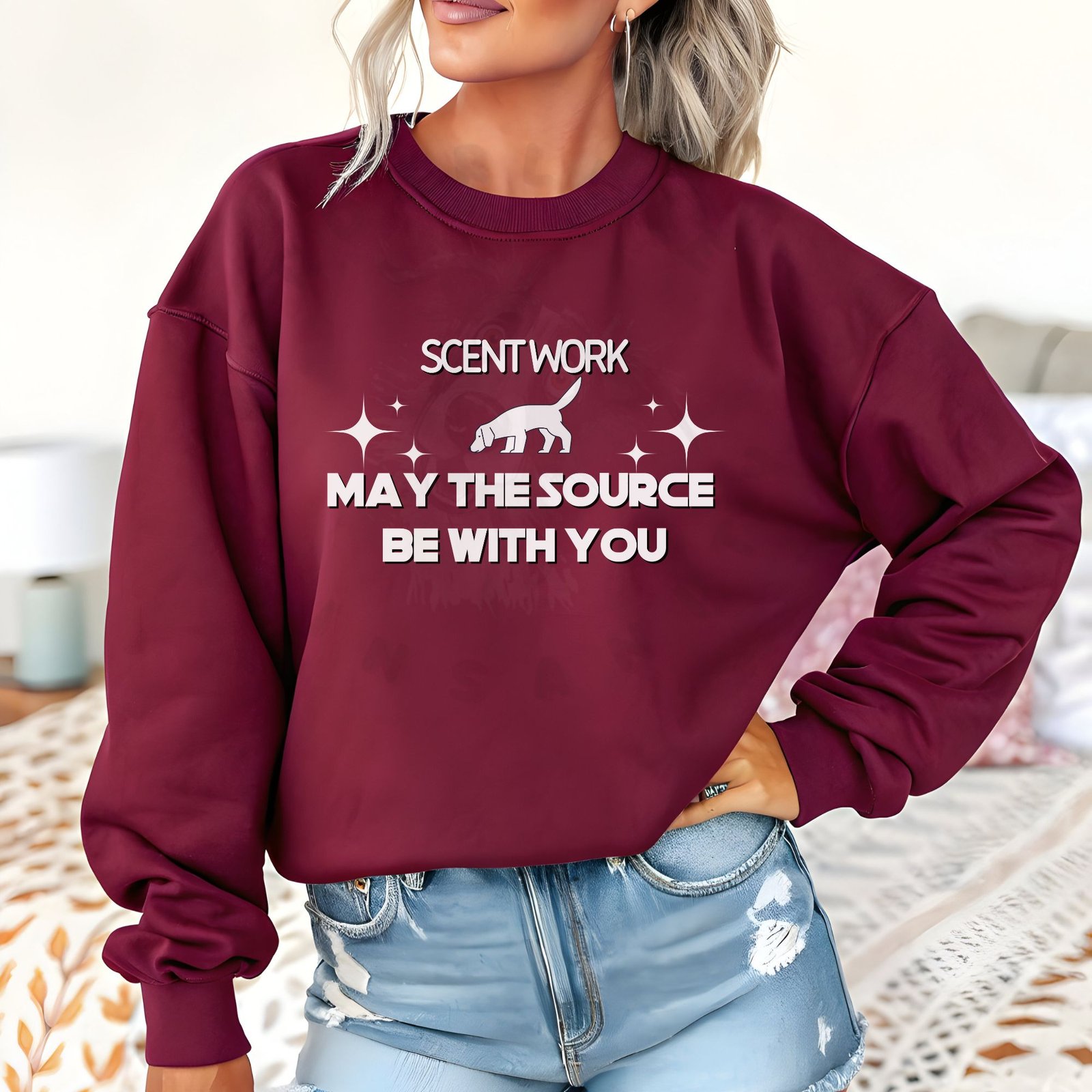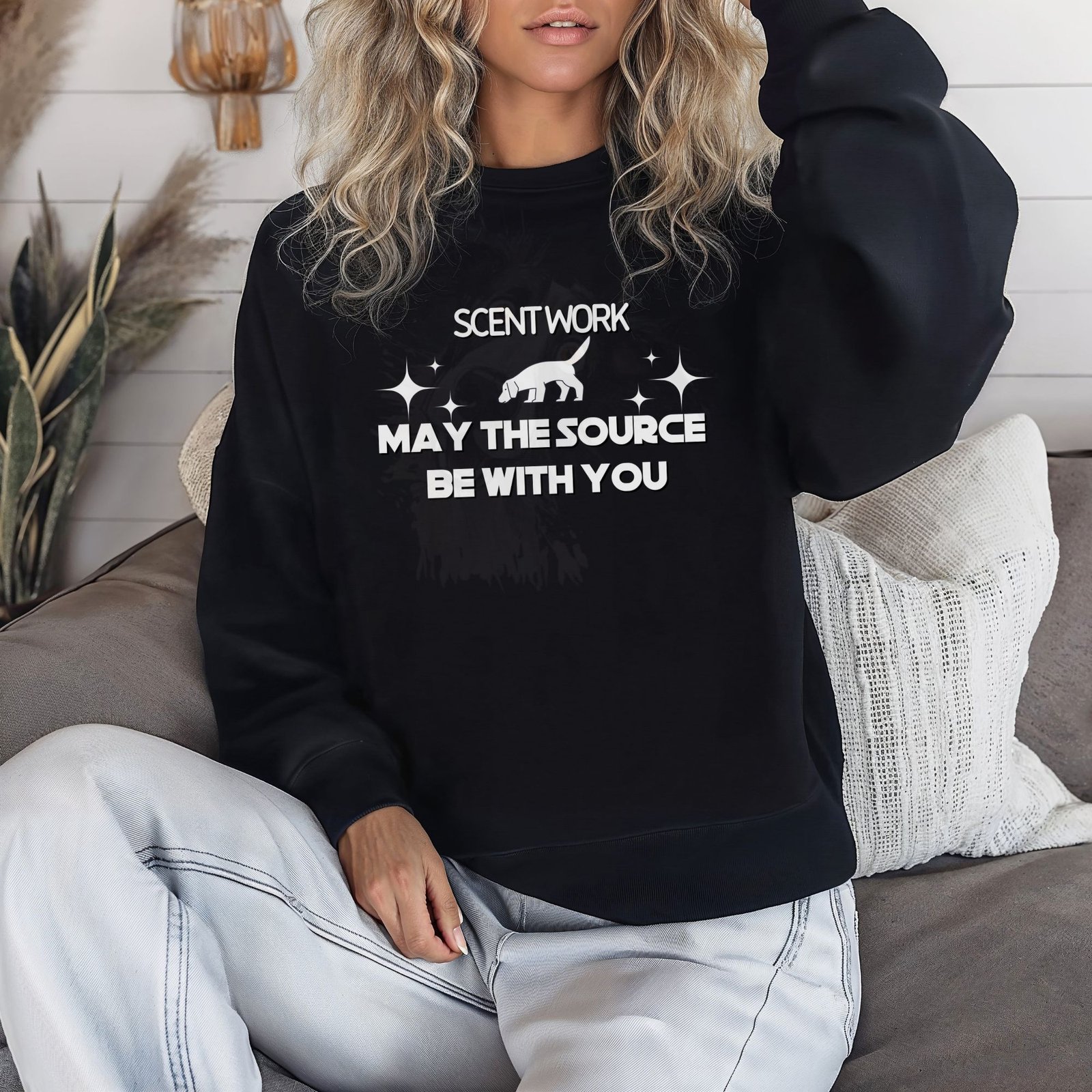 “Scent Work: May the Source Be With You” sweatshirt with a hilarious Star Wars pun for nose work handlers. Features a sniffing dog silhouette with stars. Perfect for K9 Nose Work, AKC Scent Work competitors, and detection dog enthusiasts. Cozy, comfortable sweatshirt for trials and training!