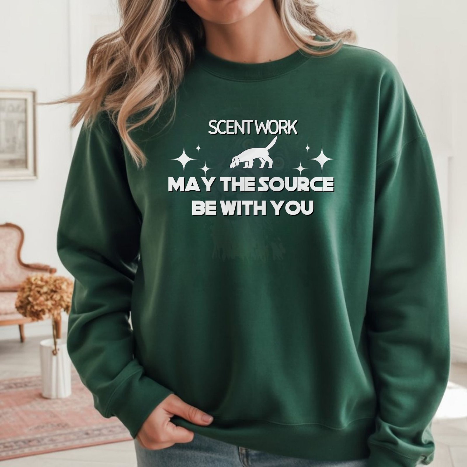 “Scent Work: May the Source Be With You” – the perfect mantra for every nose work handler! This hilarious sweatshirt combines the world of scent detection with Star Wars humor in a design that will resonate with every handler who’s ever whispered “find the source” to their searching dog. Because in scent work, finding the source IS using the force!