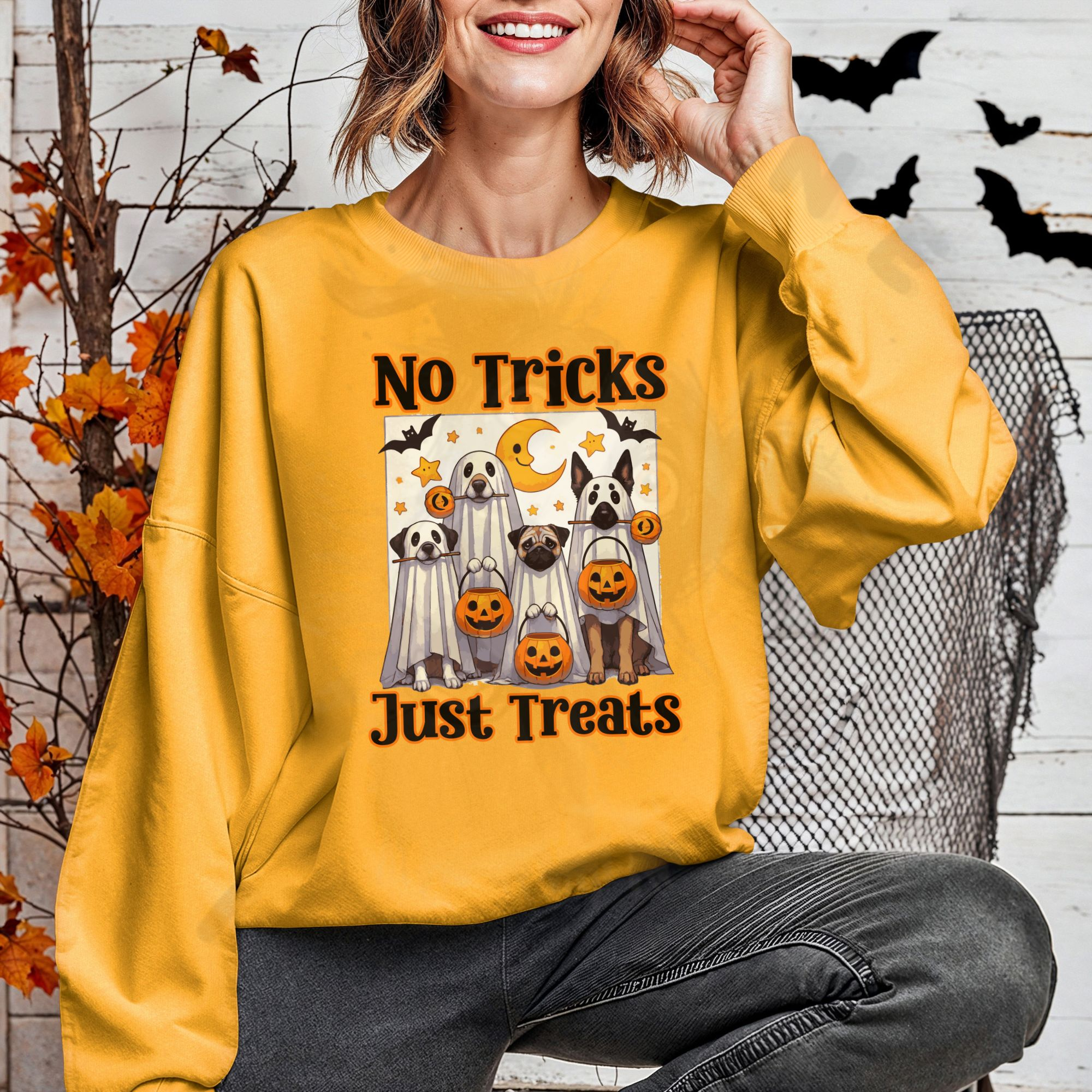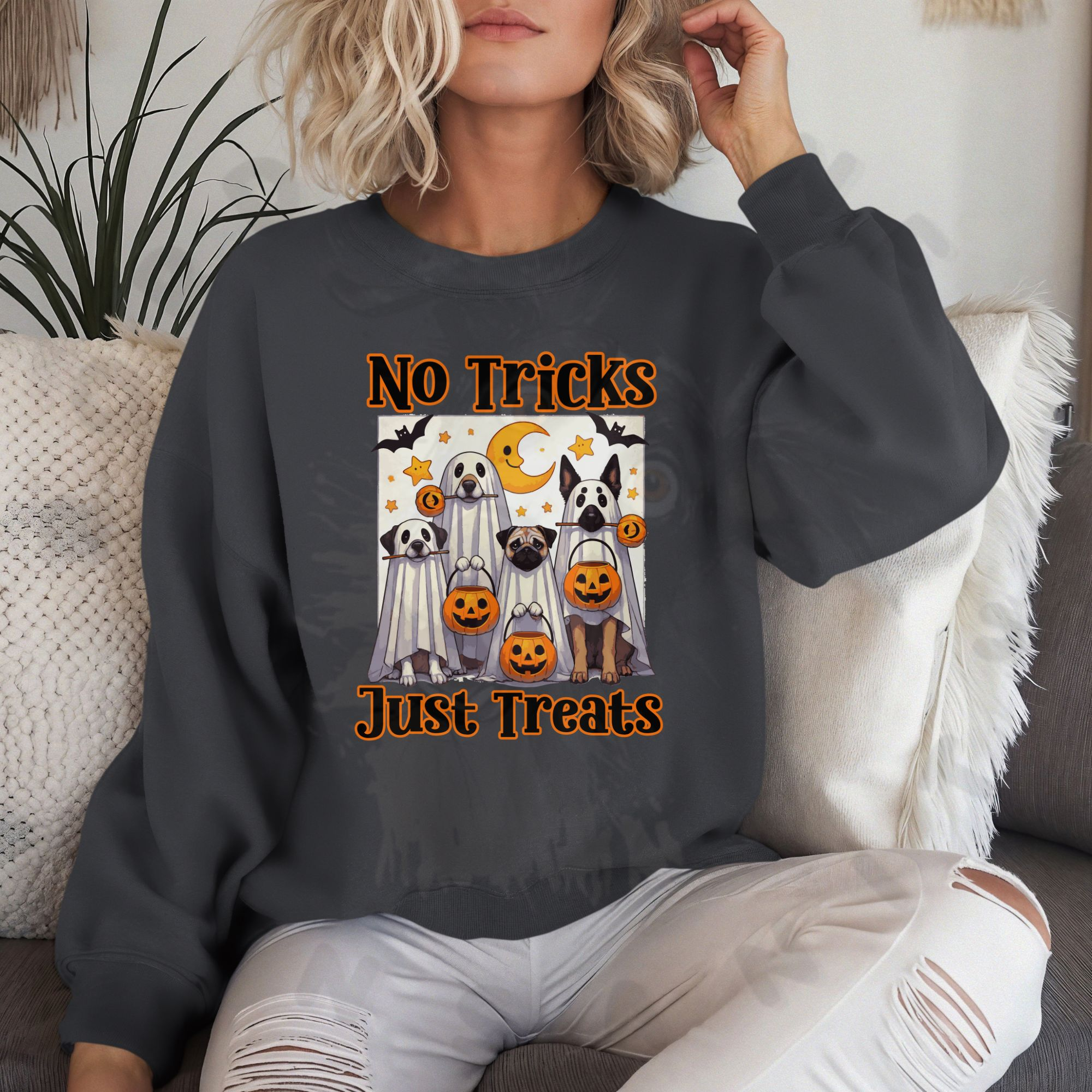 Celebrate Halloween in comfort and style! This cozy sweatshirt features ghostly pups with pumpkins and the phrase “No Tricks, Just Treats.” A must-have for dog lovers this spooky season.