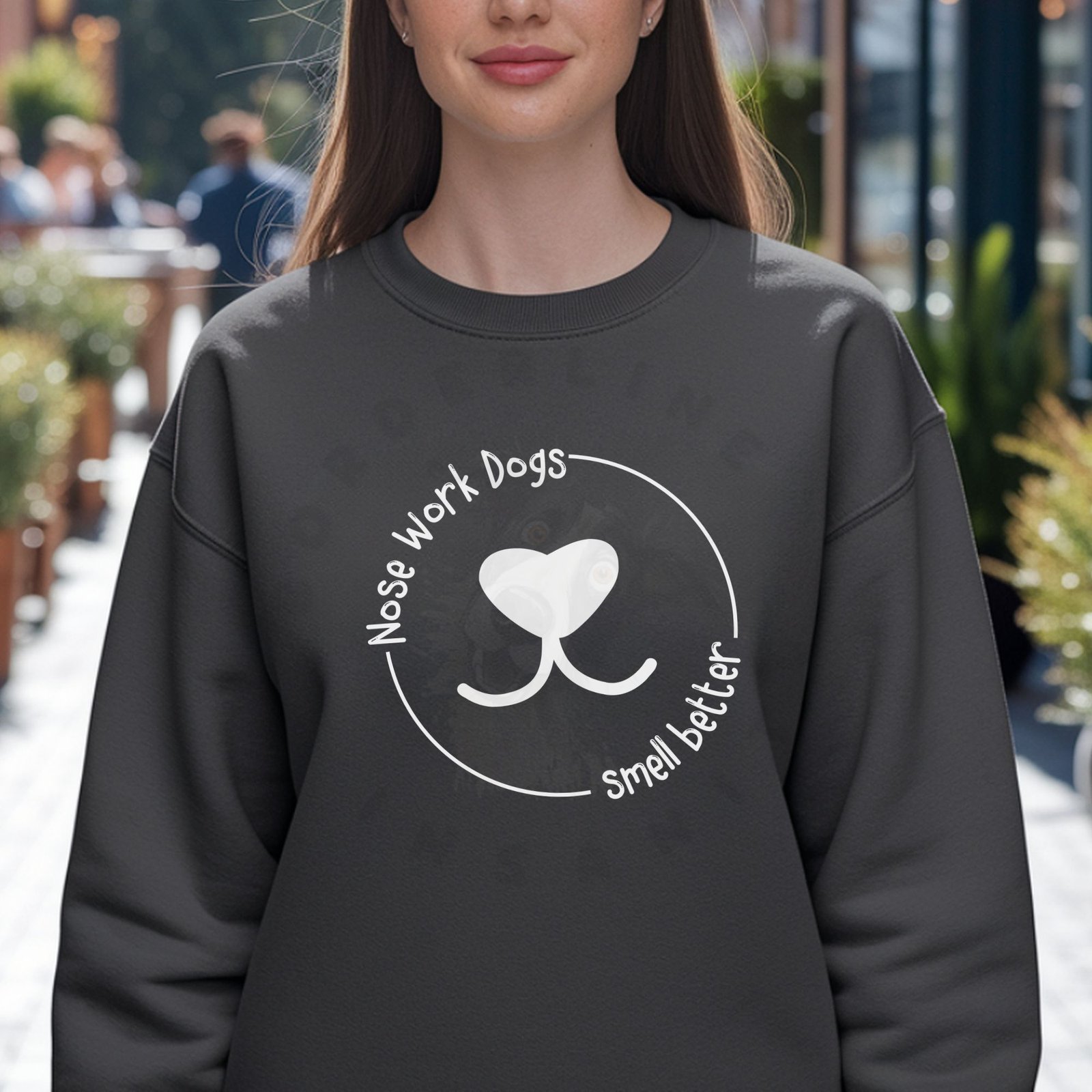 “Nose Work Dogs Smell Better” sweatshirt with clever pun and dog nose heart design. Perfect for scent work and nose work handlers, K9 Nose Work competitors, and detection dog enthusiasts. Cozy, comfortable sweatshirt for trials, training, and everyday wear. Great gift for dog sport lovers!