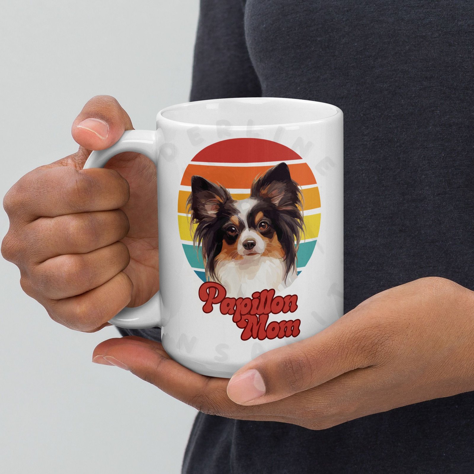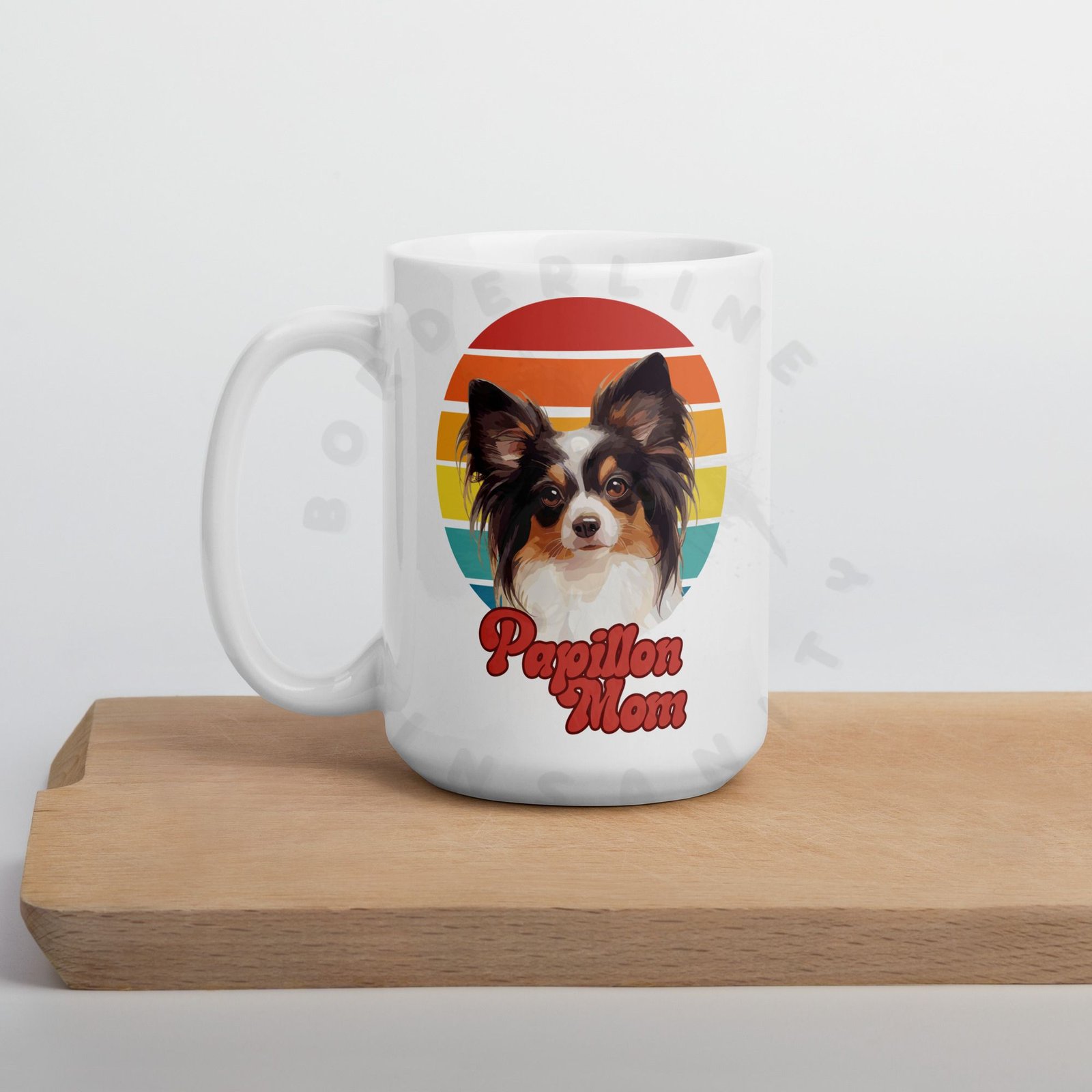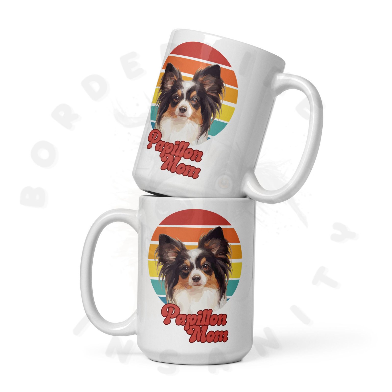 Show off your love for your Papillon every morning! This retro-inspired 15oz ceramic mug features a gorgeous watercolor Papillon portrait set against a warm sunset circle — bold, beautiful, and made for dog moms who wear their heart on their sleeve (and their mug on their desk).