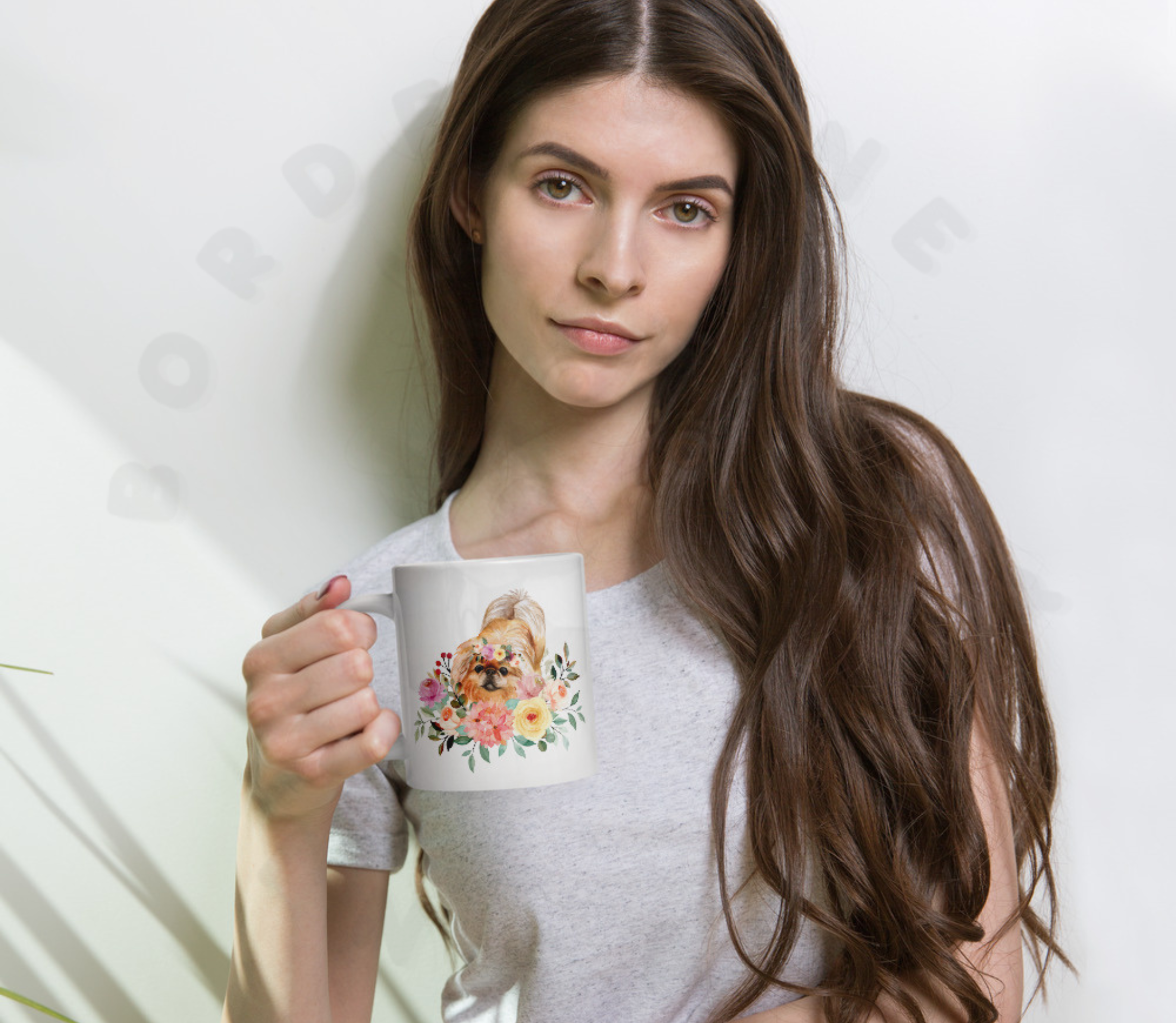 This adorable mug showcases a charming Pekingese surrounded by soft yellow roses, pink, and coral blooms. The Pekingese’s expressive eyes and fluffy coat are beautifully complemented by the delicate watercolor flowers, creating a perfect tribute to this beloved toy breed.
