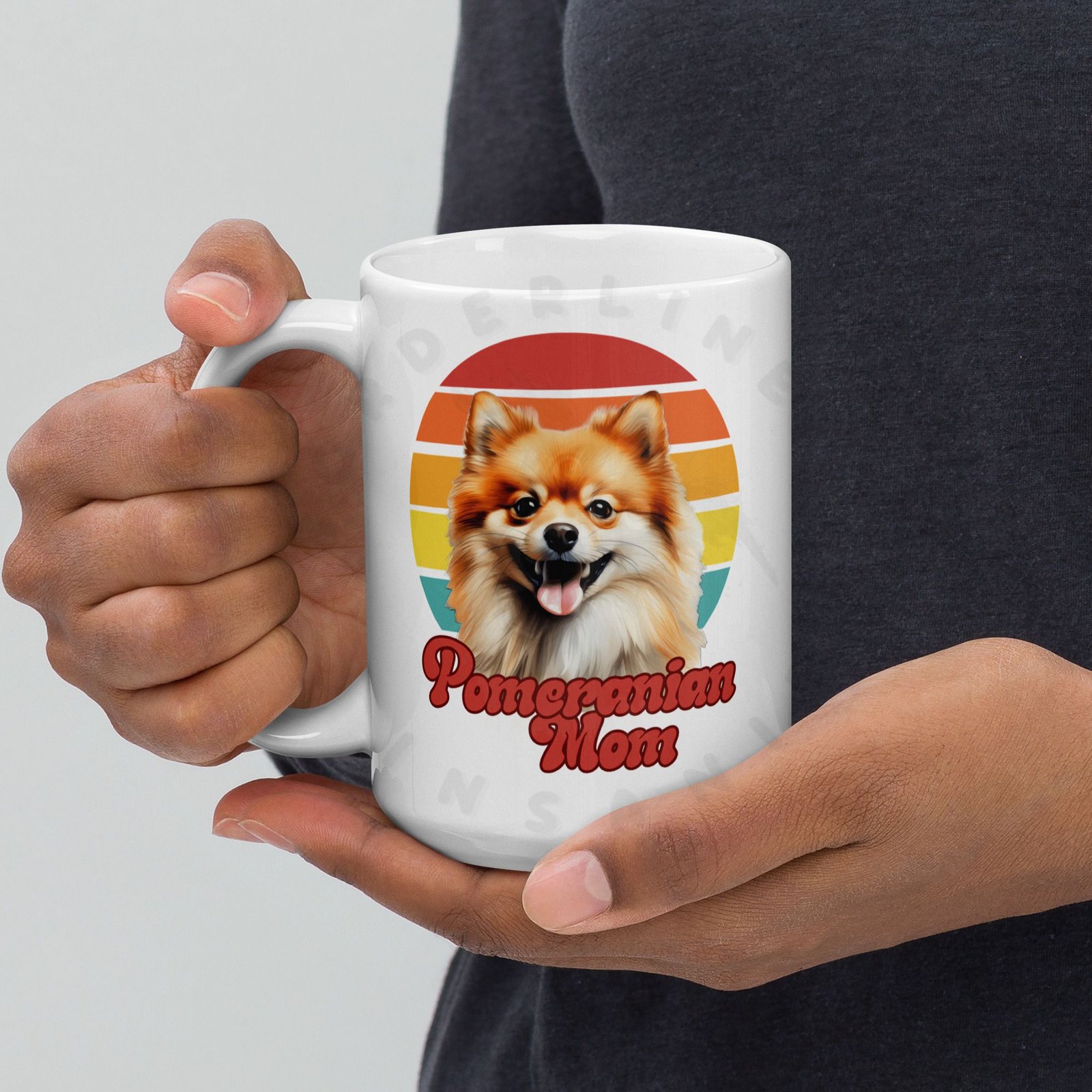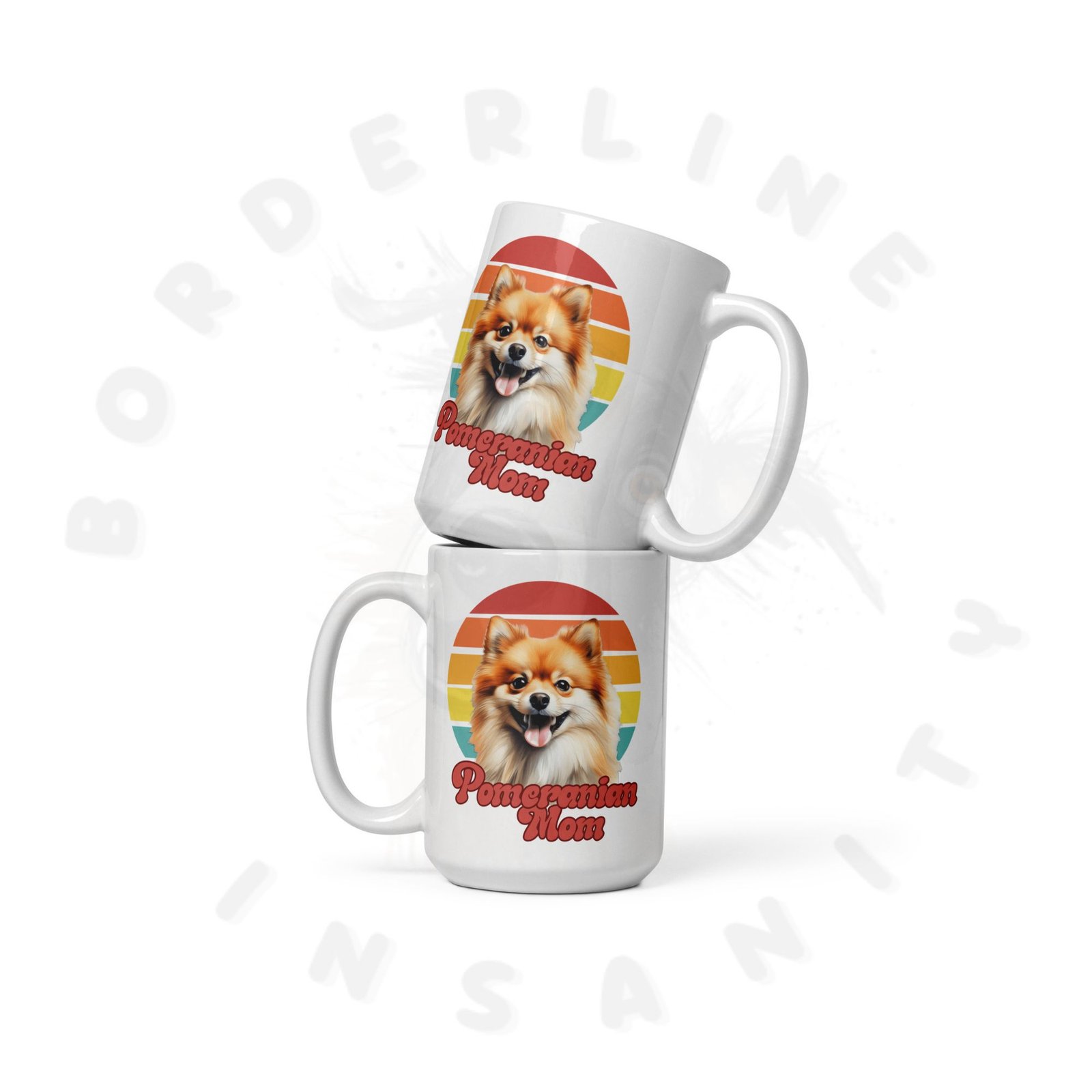 Show off your love for your Pomeranian every morning! This retro-inspired 15oz ceramic mug features a gorgeous watercolor Pomeranian portrait set against a warm sunset circle — bold, beautiful, and made for dog moms who wear their heart on their sleeve (and their mug on their desk).
