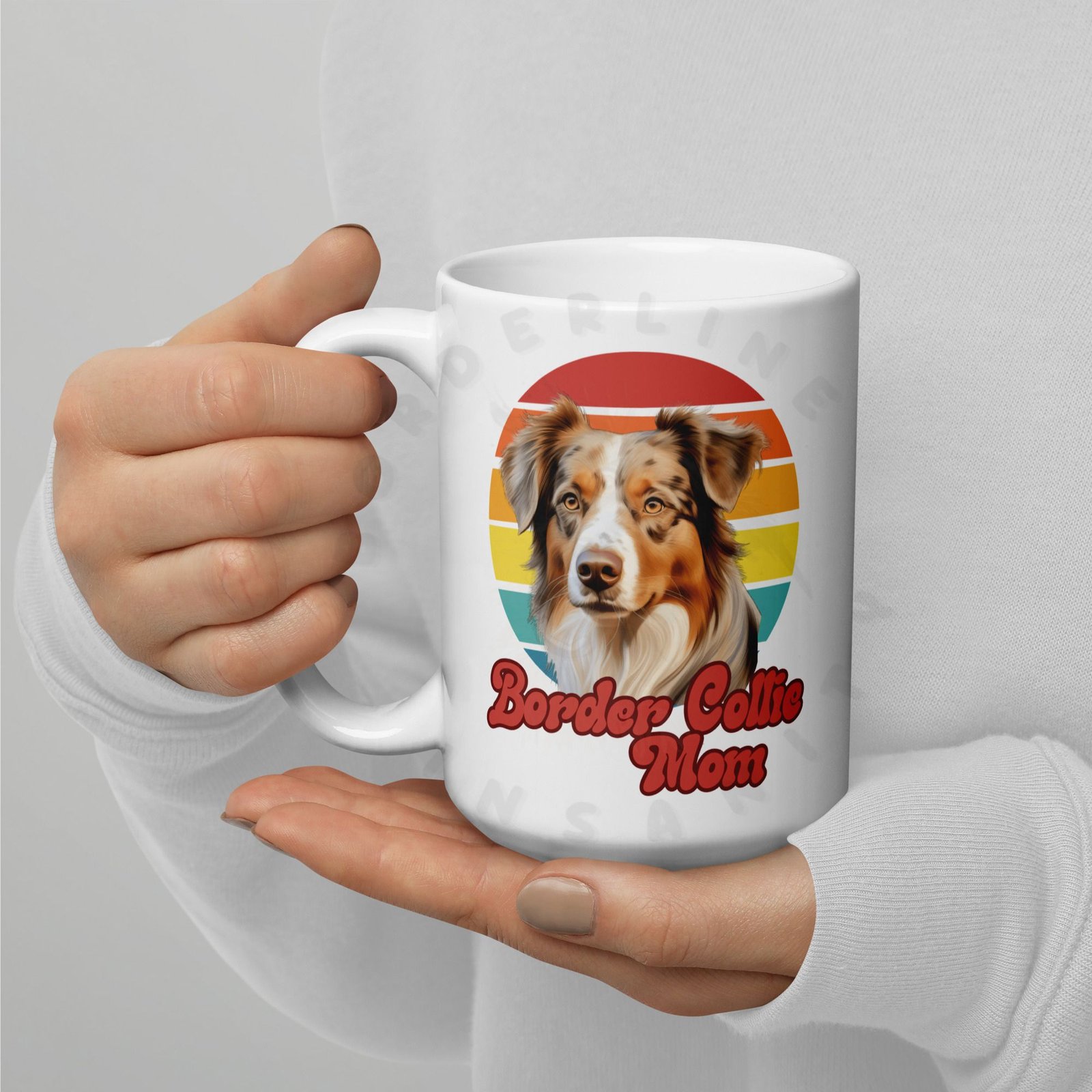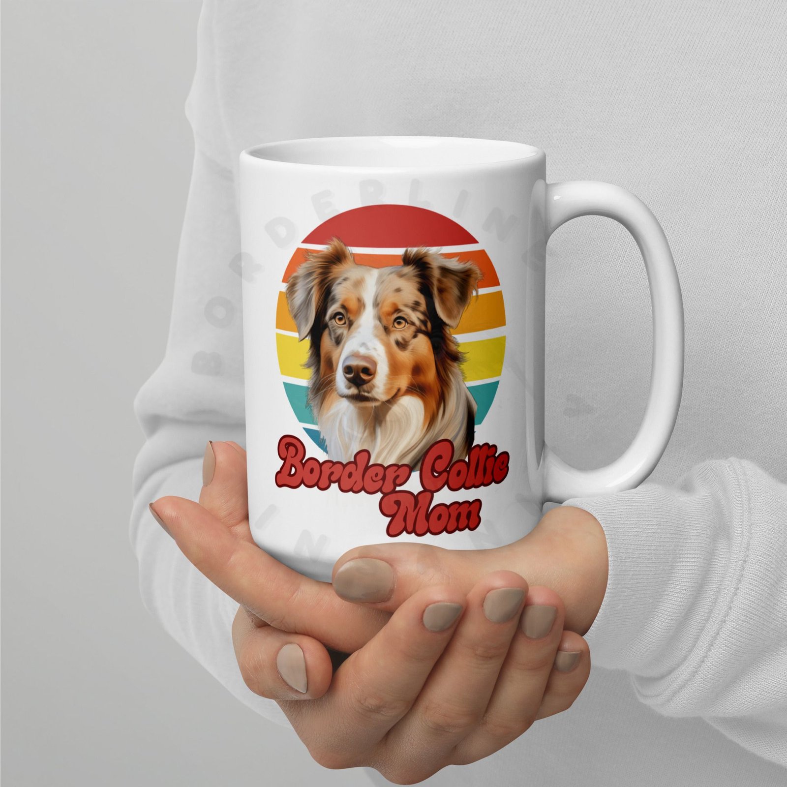 Show off your love for your Red Merle Border Collie every morning! This retro-inspired 15oz ceramic mug features a gorgeous watercolor Red Merle Border Collie portrait set against a warm sunset circle — bold, beautiful, and made for dog moms who wear their heart on their sleeve (and their mug on their desk).
