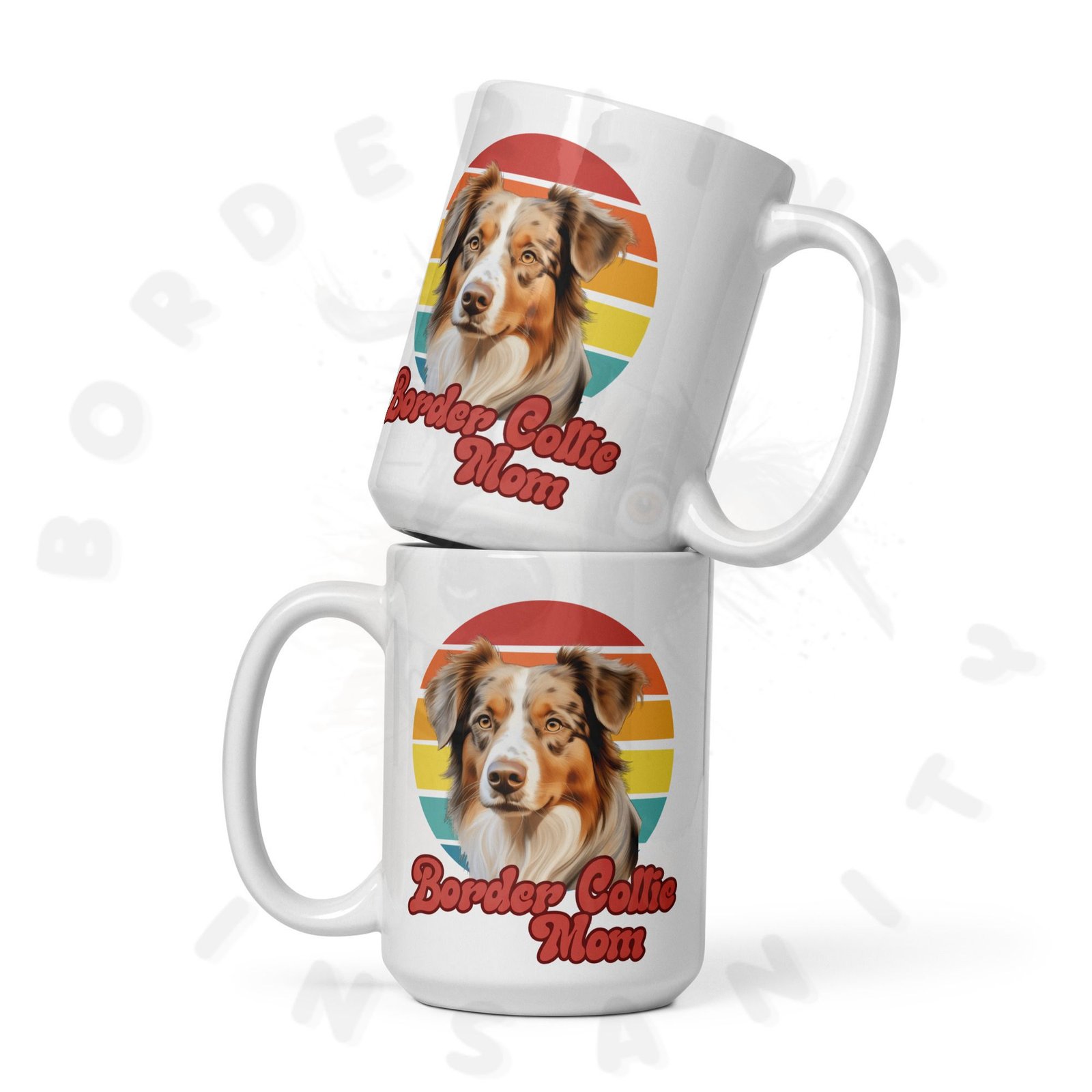 Red Merle Border Collie Mom Mug | Retro Sunset Dog Mom Gift | 15oz Ceramic Coffee Mug