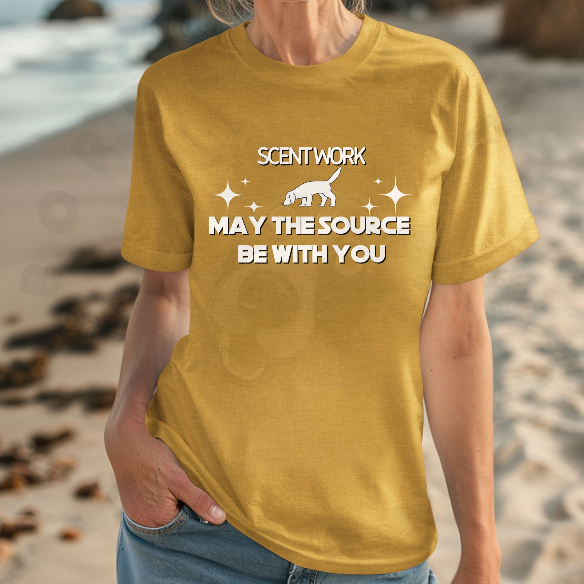 Celebrate scent work and sci-fi in one shirt! This comfy tee features “Scent Work May the Source Be With You” in iconic galactic-style font with a sniffing dog silhouette. Perfect for training, competitions, or casual wear.