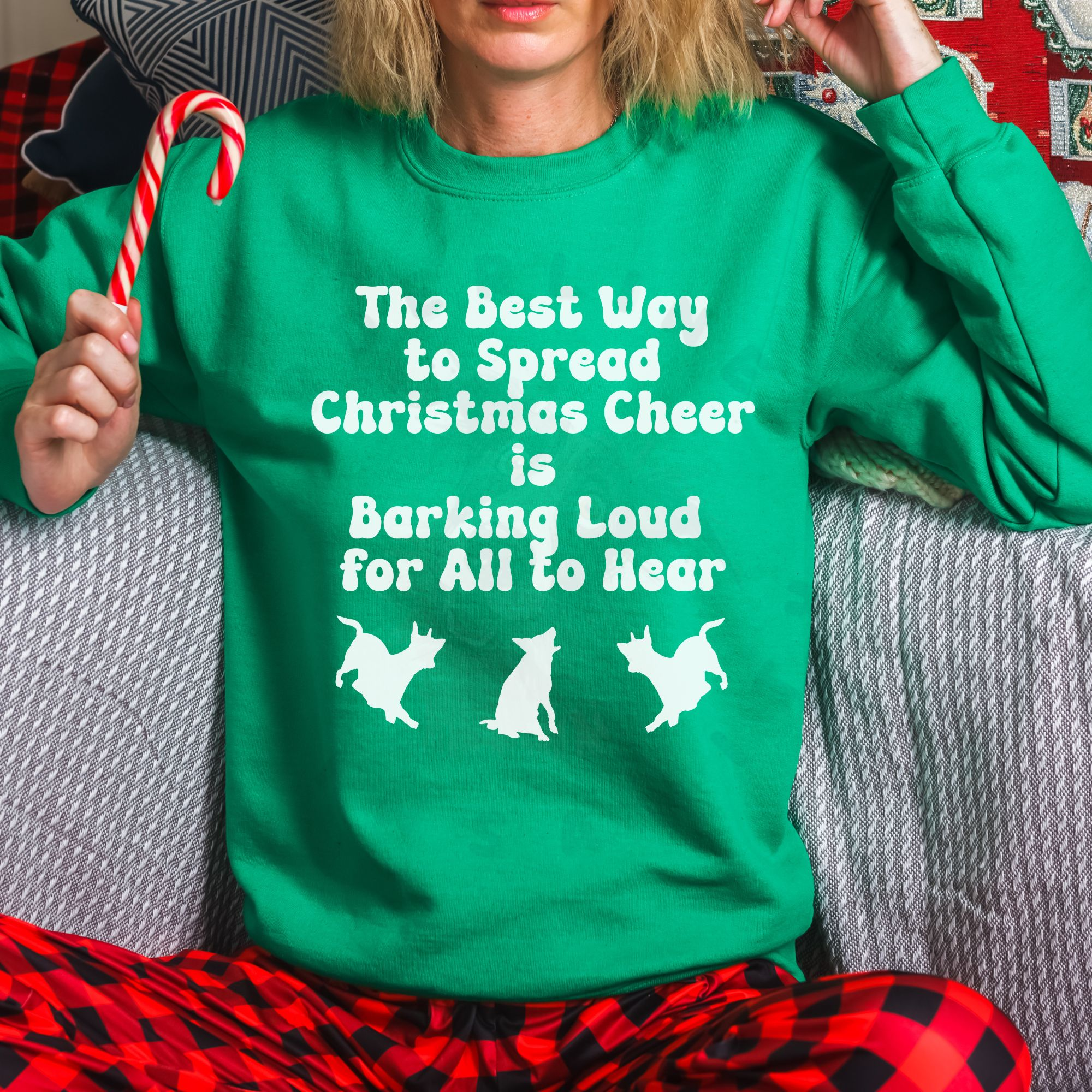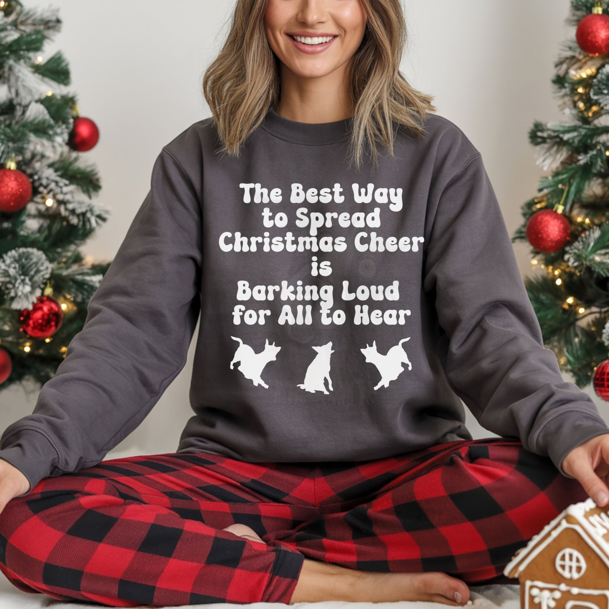 Spread holiday cheer with this festive tee that says “The Best Way to Spread Christmas Cheer is Barking Loud for All to Hear” with three barking dog silhouettes.