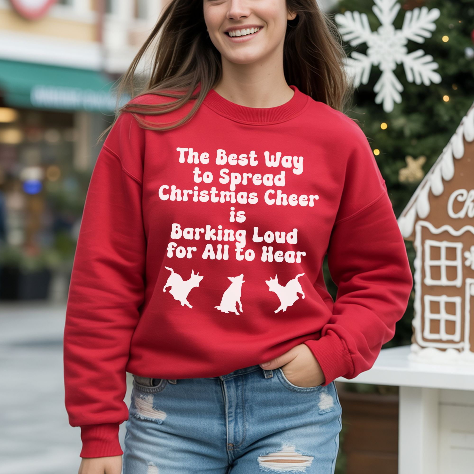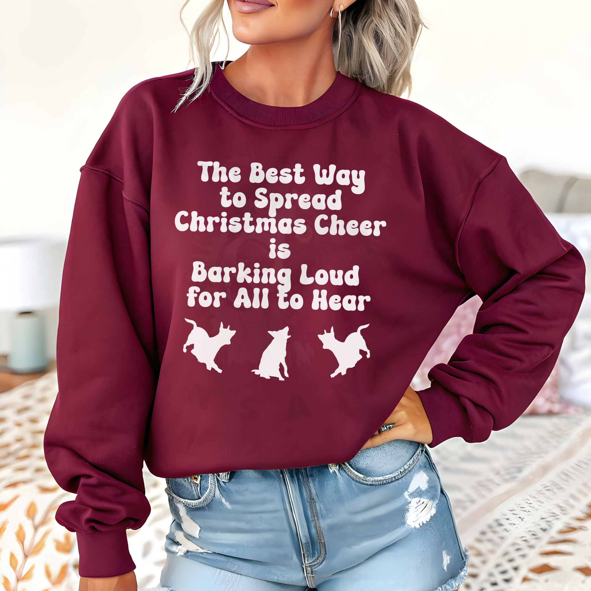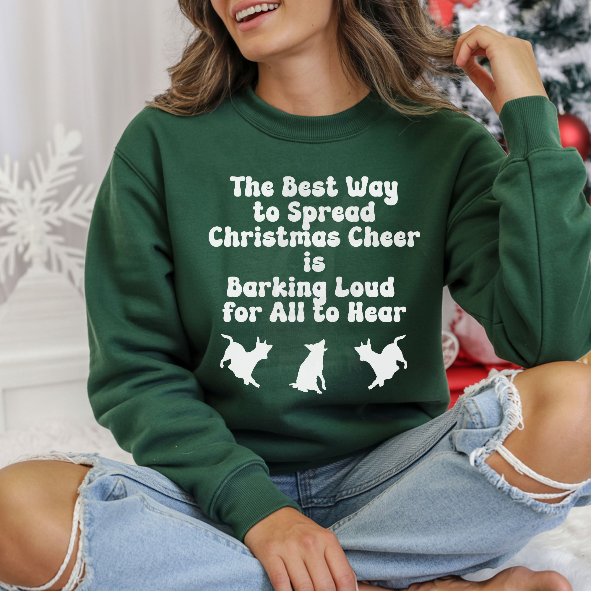 Add some howl-iday spirit to your wardrobe with this fun “The Best Way to Spread Christmas Cheer is Barking Loud for All to Hear” tee! Featuring the festive phrase from a holiday classic with a dog-lover twist, the design includes three playful dog silhouettes barking beneath the text. Perfect for Christmas parties, family gatherings, or cozy nights by the tree, this shirt makes a great gift for dog owners and anyone who believes the holidays are merrier with furry friends.