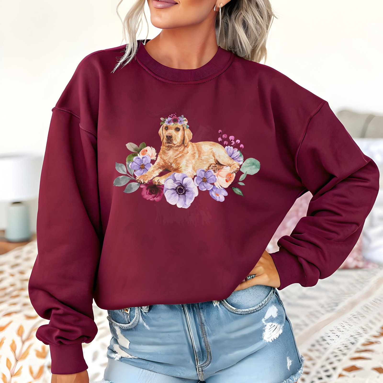 Cozy watercolor Jack Russell crewneck with warm florals. Spunky terrier portrait with flower crown. Perfect JRT lover gift!