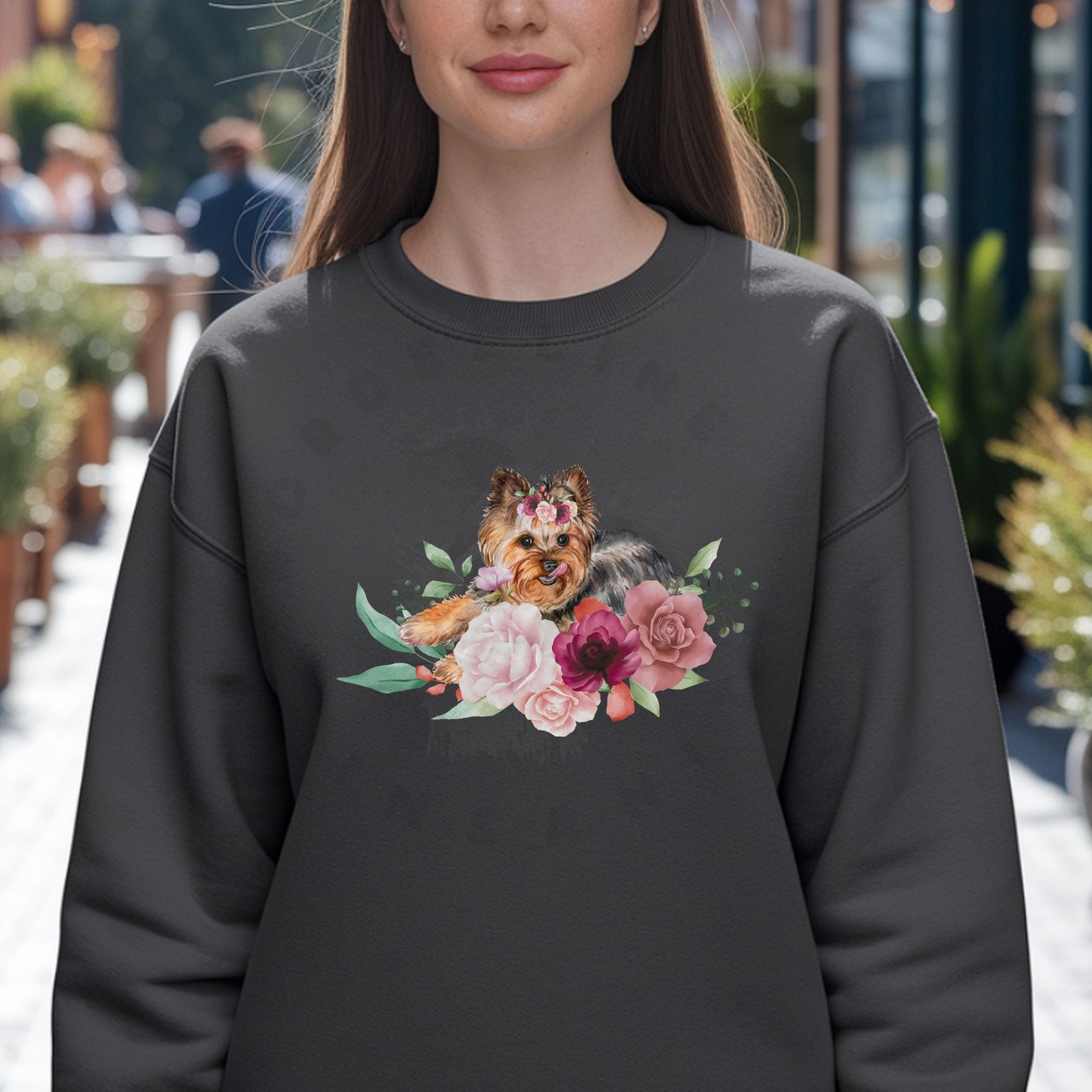 Why You’ll Love This Sweatshirt: Stunning watercolor art, beautiful floral colors, captures Yorkie cuteness, super comfortable and cozy, elegant design, perfect for cooler weather