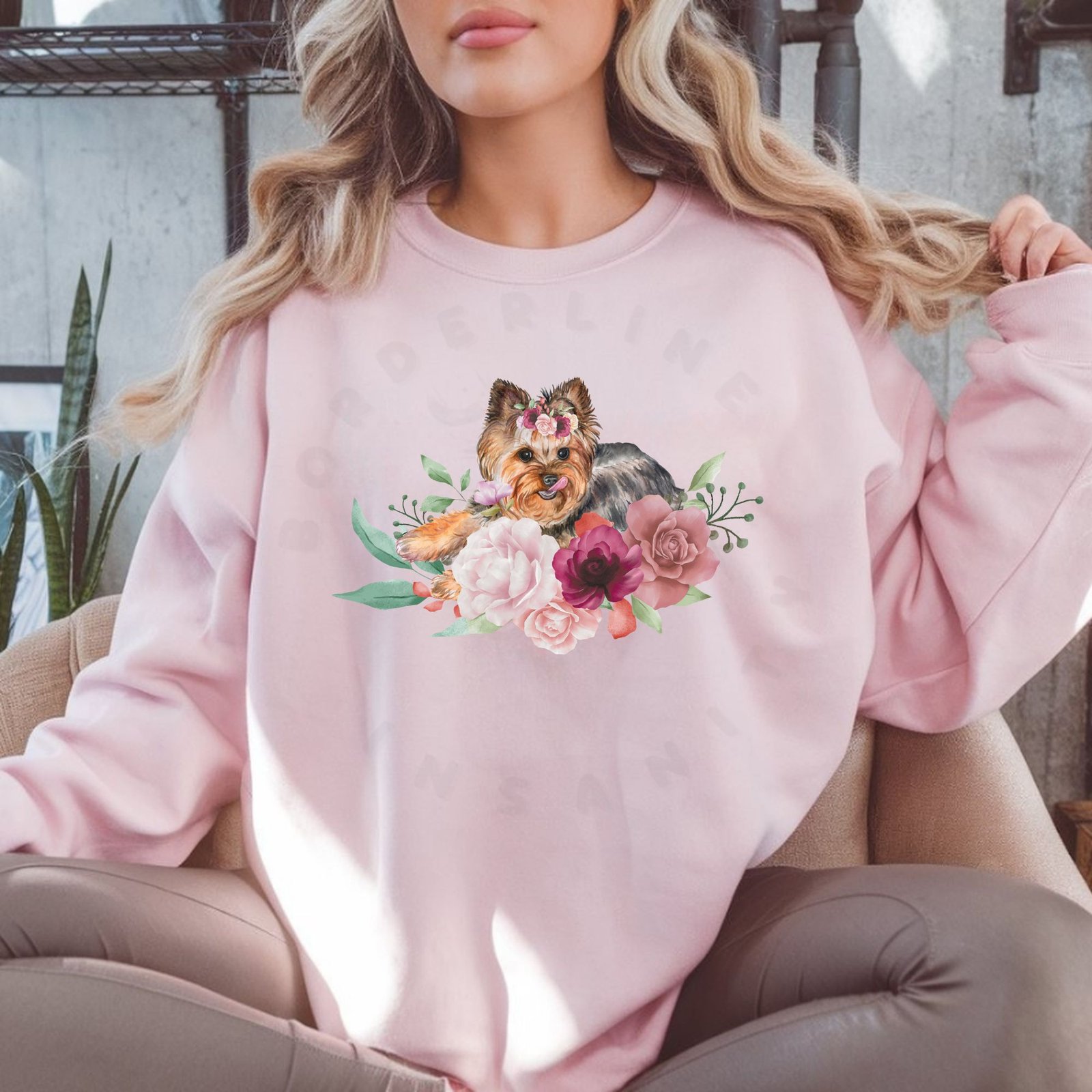 Beautiful watercolor Yorkie crewneck sweatshirt with soft floral design. Cozy Yorkshire Terrier portrait with flower crown. Perfect gift for Yorkie lovers, fall/winter wear!